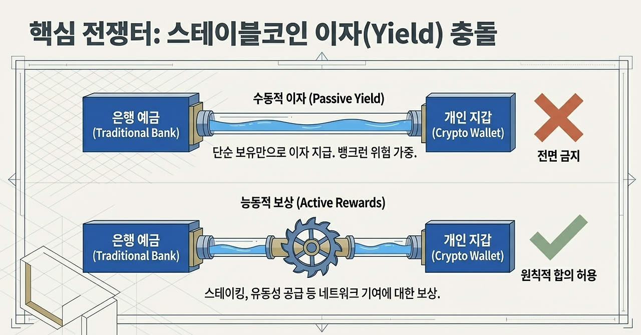 전통 은행권과 크립토 업계가 가장 치열하게 맞붙었던 지점은 '수익률 지급' 문제였습니다. 미국은행협회(ABA)는 스테이블코인이 이자를 지급할 경우, 대규모 예금이 이탈하여 은행 시스템의 신용 공급 능력이 붕괴될 것을 우려해 왔습니다.