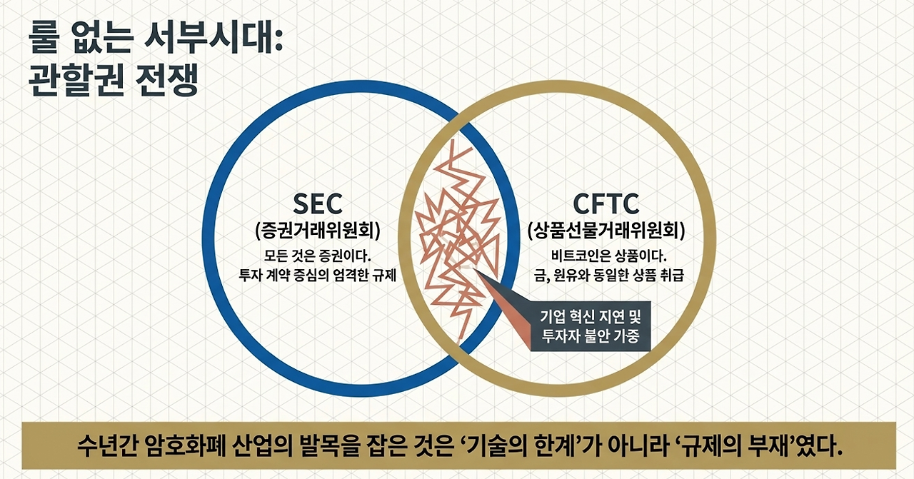 현재 미국의 암호화폐 시장을 정의하는 단어는 '규제적 파편화(Regulatory Fragmentation)'입니다. 총성만 들리지 않을 뿐, 디지털 자산의 관할권을 두고 벌어지는 SEC(증권거래위원회)와 CFTC(상품선물거래위원회)의 영토 전쟁은 마치 규칙 없는 서부 개척 시대를 연상케 합니다. 이러한 제도적 불확실성 속에서 혁신은 위축되었고, 기업들은 규제의 사각지대에서 방황해 왔습니다.