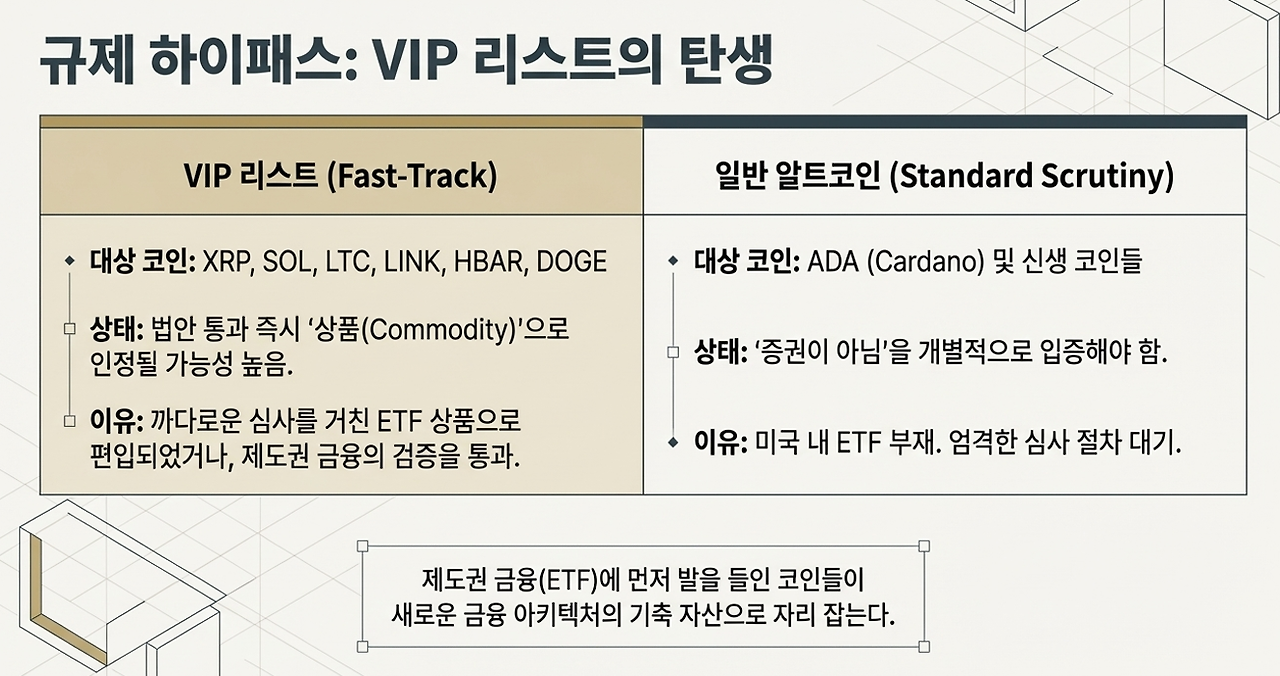 반면, 카르다노(ADA)처럼 시가총액은 높지만 미국 내 ETF가 없는 코인들은 이 '프리패스'에서 소외되어 험난한 심사 과정을 거쳐야 합니다. 이는 법안이 본질적으로 '공정성 논란'을 내포하고 있으며, 제도권 금융에 먼저 발을 들인 자들이 시장을 선점하는 '승자독식 구조'를 합법화하고 있음을 시사합니다.