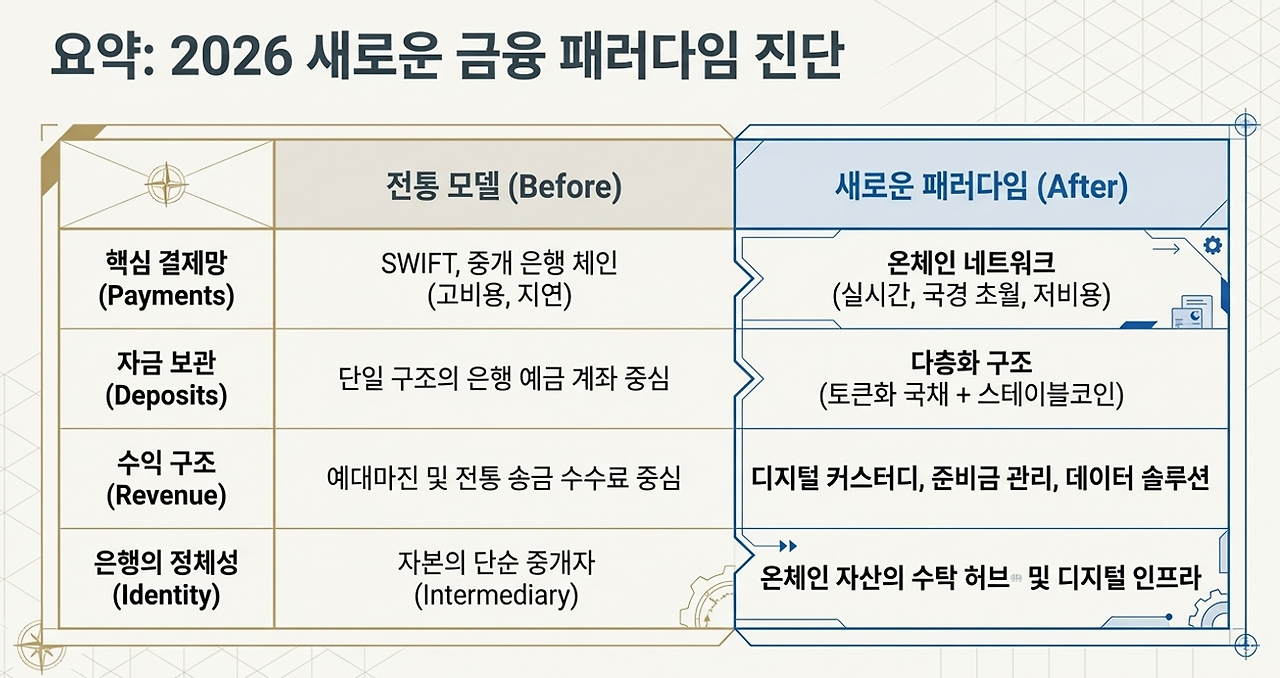 클래리티 법안은 은행의 비즈니스 모델을 근본적으로 재정의합니다. 스테이블코인이 제도권 결제 수단으로 안착하면, 은행은 단순한 대출 기관을 넘어 '온체인 금융의 준비금 허브'로 진화하게 됩니다.