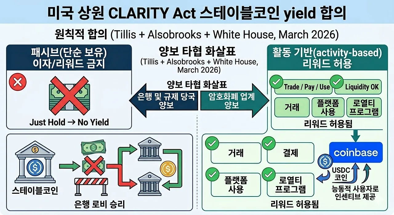 수동적 보유(Passive) 이자 금지: 지갑에 보관만 하는 스테이블코인에 대한 이자 지급을 금지하여, 스테이블코인이 '규제받지 않는 예금'으로 변질되는 것을 원천 차단했습니다.