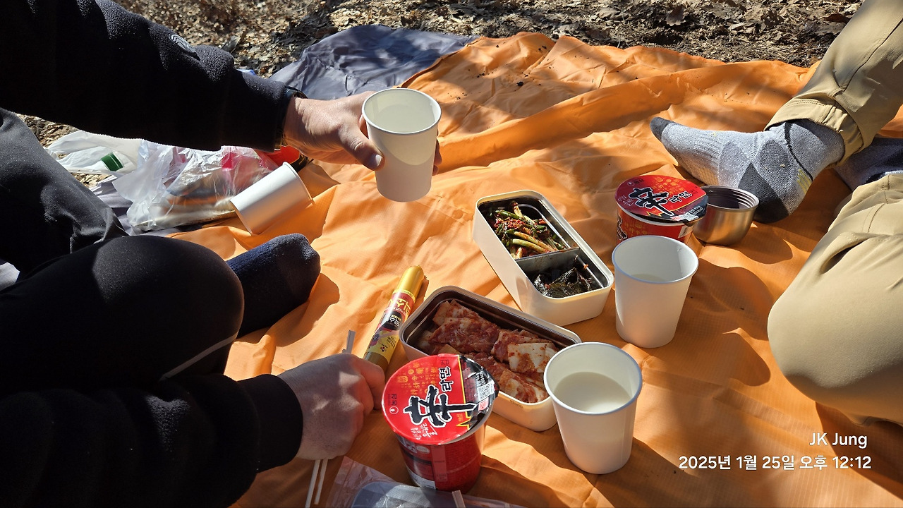 정상에서 식사(정상라면과 과일)와 대화를 충분히 나눈 후 삼곡초교쪽으로 하산을 했다.