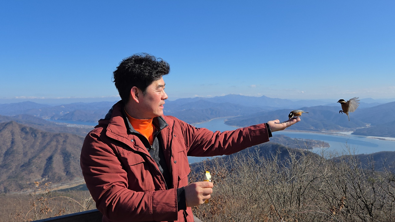 정상에는 정상 표지목에서 사진찍는 몇팀만 있었기에 미안해하지 않고 우리도 단체사진과 개인 인증사진을 찍고 정산 근처에서 점심을 먹었다. 무엇보다 감악산 정상에서만 즐길 수 있는 감악산 박새와의 교감이 너무 좋았다.