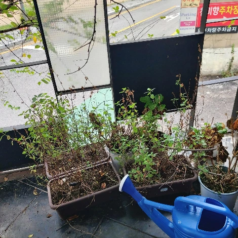 지난주 송충이의 습격으로 그 근처에는 무서워서 얼씬도 못하게 되어 물도 자주 주지 못했는데 다행히 비가 몇 번 와서 마르지는 않은 것 같습니다. 자그마한 허브들... .