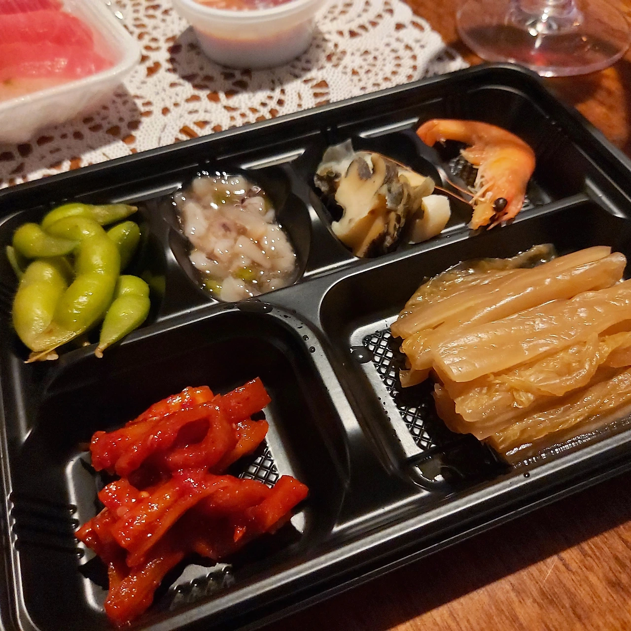타코 고추냉이, 껍질콩, 소라회, 찐 새우, 무말랭이, 묵은지 무침입니다. 이 반찬들만으로도 소주 한 병은 거뜬히 비울 각 나옵니다.