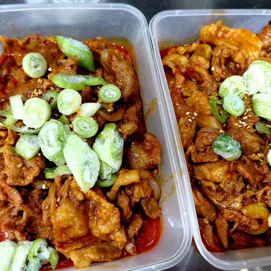 매콤한 양념의 제육볶음도 밀폐용기에 넣어 한 끼 분량씩 만들어 소분해두었어요. 집에도 몇 개 가지고 가고 가게에 두고도 전자레인지에 데워서 바로 먹을 수 있도록 해 놓았지요. 이렇게 해두면 시간이 없어도 밥만 넣고 비벼 먹으면 든든하게 배를 채울 수 있으니 정말 간편합니다.