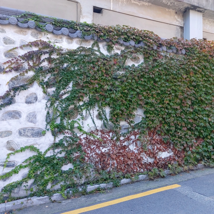 세종대 돌담길, 나를 반겨주는 담쟁이넝쿨이다. 이제 조금씩 가을 옷을 입고 있네. 담벼락에 꼭 달라붙어 의지하며 사는 인생, 아니 잎생인가? '평생 벽에 딱 붙어 안 떨어지려고 바둥바둥 사는 네 잎생도 가련하다'라는 마음이 들려다가 멈췄다.