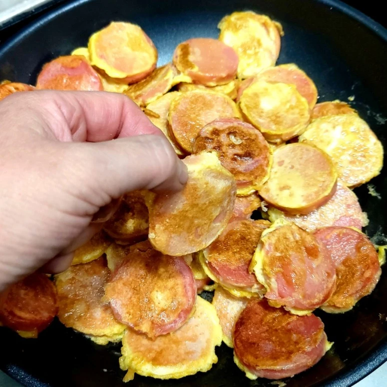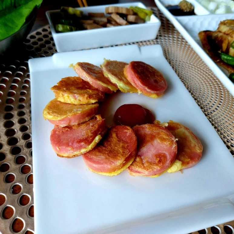 아! 제가 제일 좋아하는 분홍 소시지 부침입니다. 쪽파가 없어서 계란 물만 입혔어요. 냄새만 맡아도 행복하네요. 막걸리가 없어서 좀 아쉬웠지만 오늘은 밥반찬이니까 패스합니다.