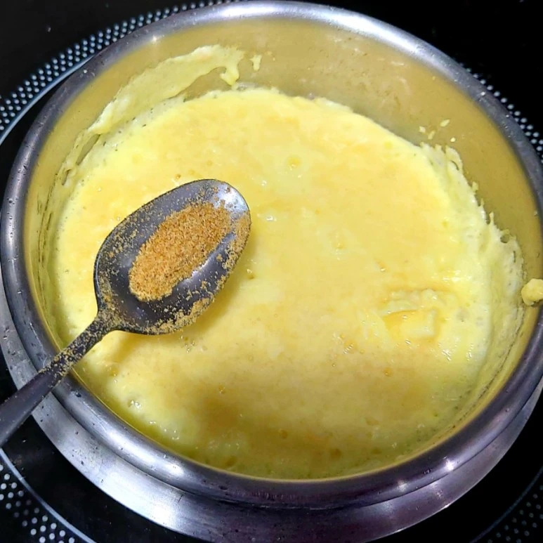 그리고 어느 정도 계란이 익어갈 때까지는 숟가락으로 저어줍니다. 몽글몽글 계란이 뭉치듯이 익어가면 불을 가장 약하게 줄이고 뚜껑을 덮어서 구수한 냄새가 날 때까지 익히면 완성이에요.