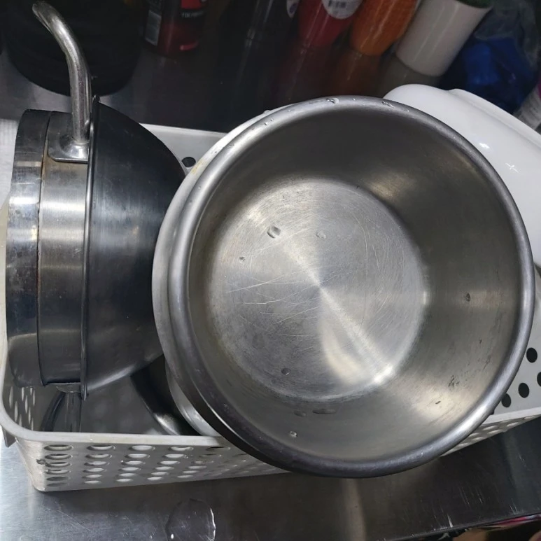 오른쪽은 소꿉장난 같은 사장의 식기 통입니다. 뚝배기 2개, 아주 작은 미니 냄비 1개, 국그릇 2개, 밥공기 2개, 수저받침 2개입니다. 양식 판매하는 와인 바이긴 하지만 사장도 먹고살아야죠. 그래서 집에서 제가 먹을 한식 그릇들이랑 수저는 챙겨와서 저렇게 다 먹고는 씻어서 보관하고 있습니다,