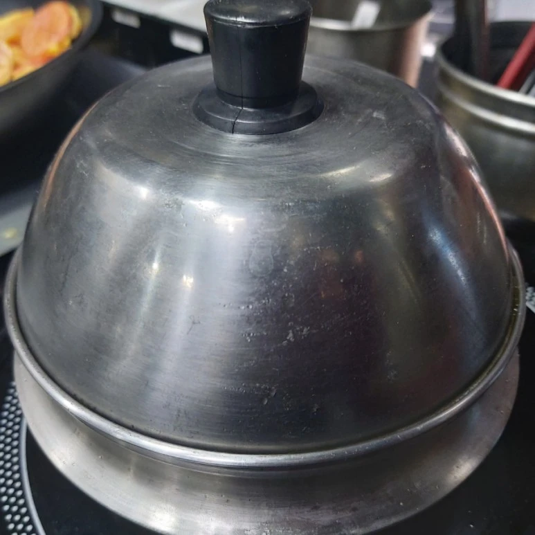 계란찜은 뚜껑을 덮은 다음 약불에서 오래 끓여야 잘 부풀어 오릅니다. 중간에 답답증이 생겨도 절대 열어보면 안 됩니다. 푹 꺼지거든요. 저 뚜껑은 계란이 부풀어 오를 것에 대비해서 높이가 높은 모양으로 골라 산 거예요. 원래는 호떡 뚜껑입니다.