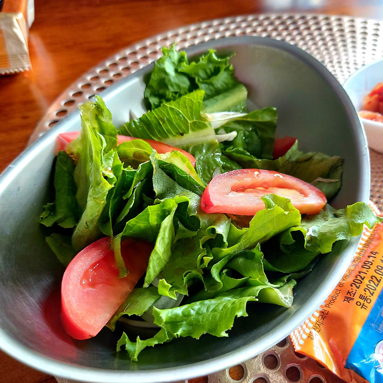 백반에 빠질 수 없는 계란 프라이! 너무 배가 고파서 기름 두른 팬을 제대로 예열하지 않아 다 달라붙었어요. 참기름에 간장 한 방울이면... 그 맛 다 아시죠? 다 아시는 토마토 샐러드고요. 이렇게 다시 보니까 무슨 구내식당 백반 차림 같네요.