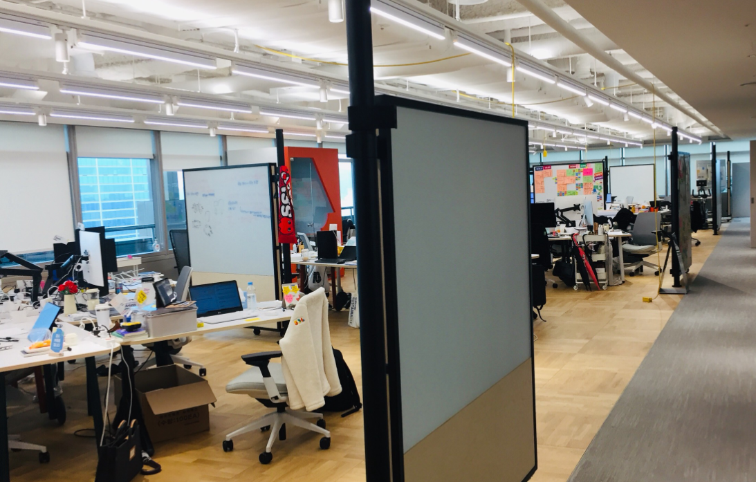 오이지 공간은 인더스트리 type의 공간감을 형성하며, 수평적 업무 방식을 추구하기에 어떤 상급자의 별도 좌석을 마련하거나 하지는 않고 있다. 그때 그때 생각의 idea를 창문에 적을 수도 있고 서로가 서로의 호칭을 이름 대신 영어이름으로 부른다.
