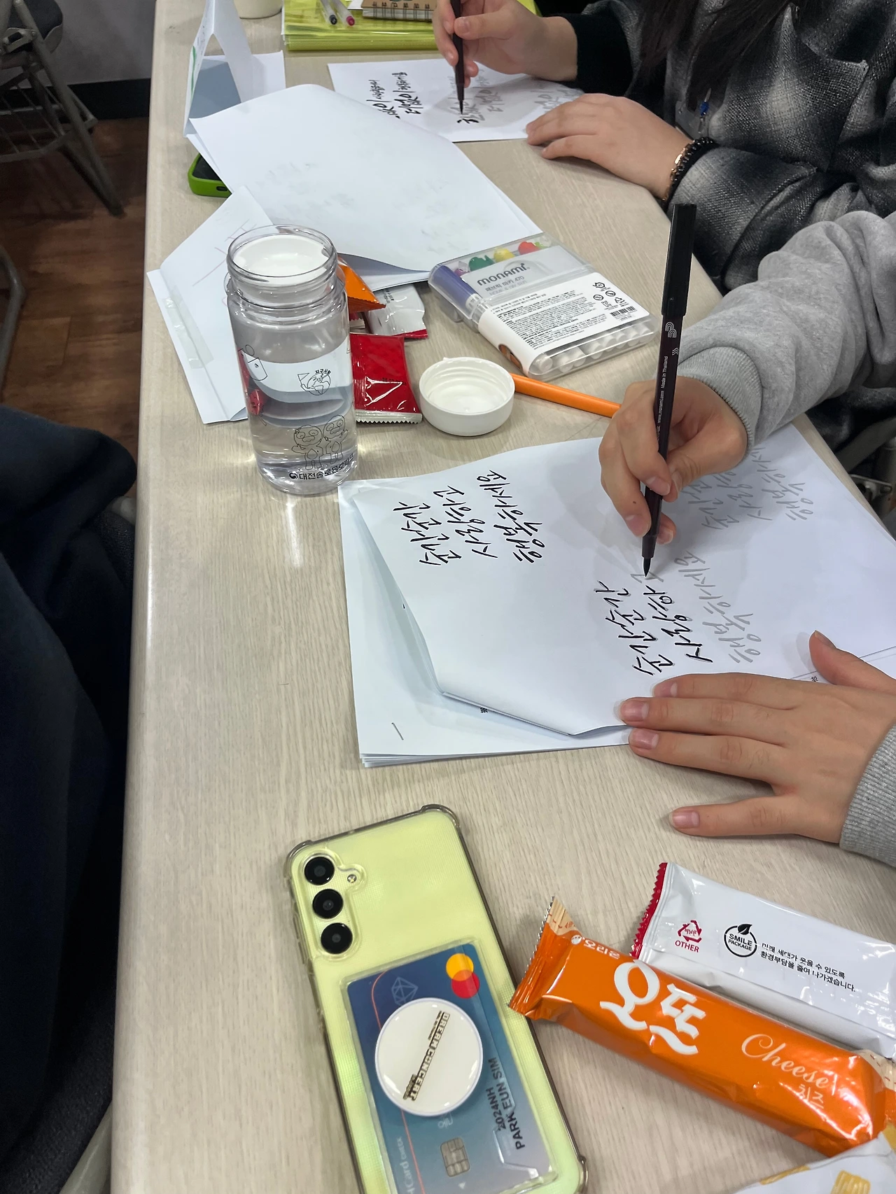 처음에는 꼭 이 주제로 써야 하냐고 묻던 학생들도 이내 집중해서 끊임없이 펜을 놀리는 모습이었다. 학생들이 그 어느 때보다도 집중해서 글을 잘 써줘서 너무 다행이고 감사했다. 동시에 ‘돈이 행복을 결정하는가’라는 주제에 대해 학생들이 평소에 느끼고 생각하는 것이 많은가 싶어서 마음이 무거워지기도 했다. 학생들이 어떻게 살아왔고 어떤 과정으로 이곳에 이르게 되었는지 자세히 알지 못하기에 감히 짐작하는 것마저 조심스러웠다. 원래 1교시를 마치기 전에 모두의 의견을 발표하고 간단한 토론을 나누는 시간을 가지려고 했으나 모든 학생들이 집중해서 글을 쓰고 있어서 흐름을 끊지 못했다. 글을 통해 어서 학생들의 생각을 알고 싶다.