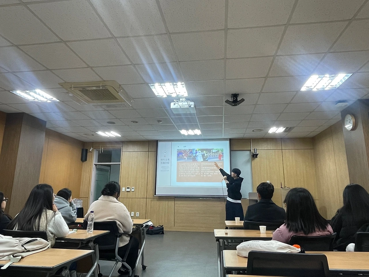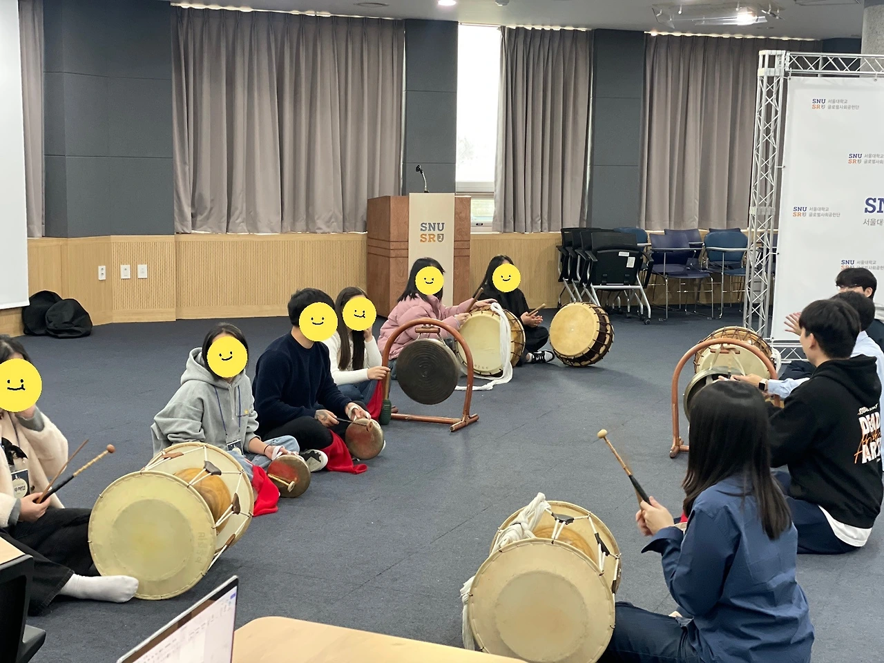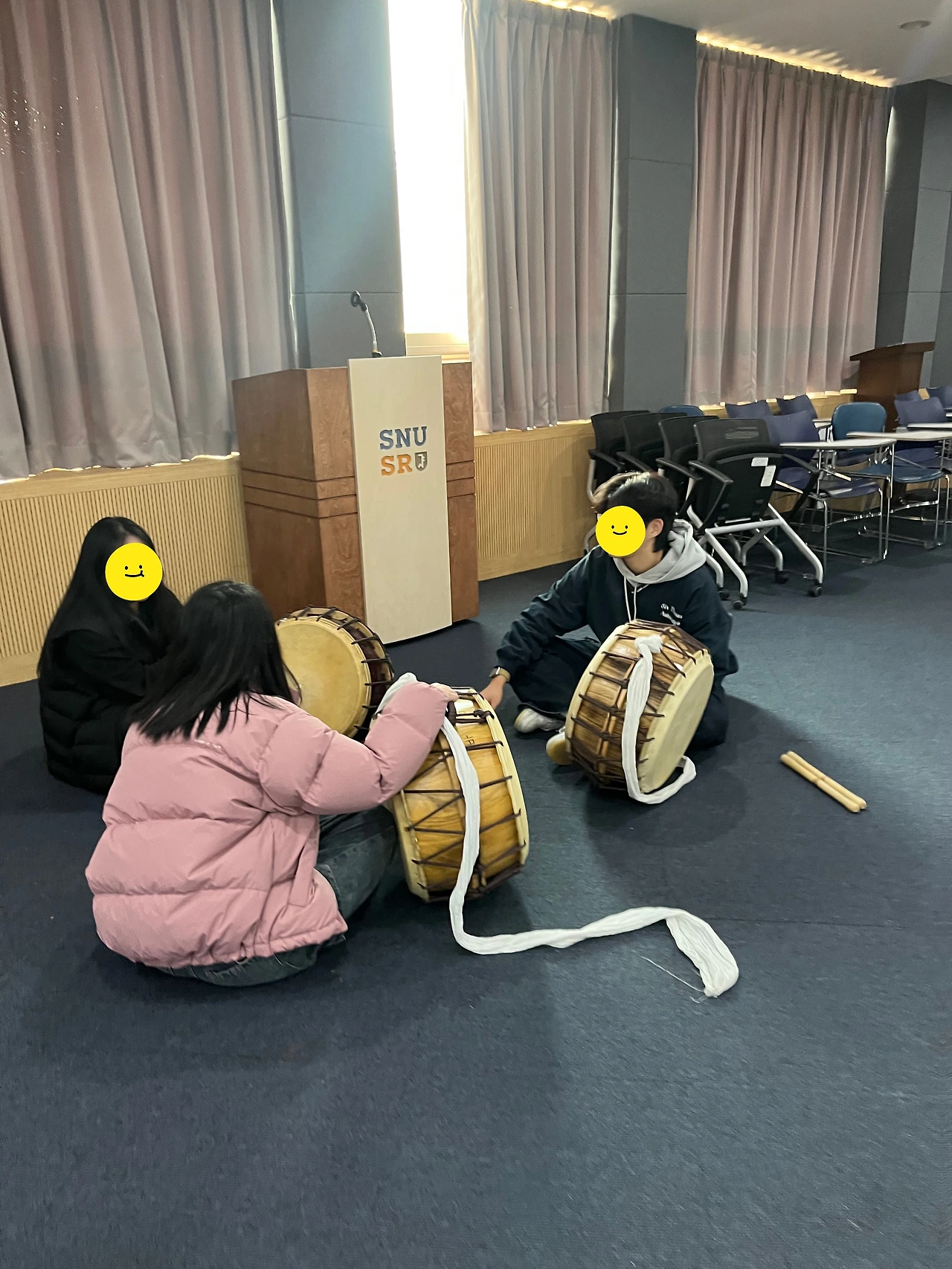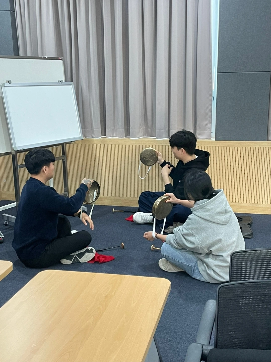 단풍연 분들의 시연으로 첫 시간을 시작했다. 교실을 가득 채우는 농악 소리에 모두 홀린 듯 집중해서 즐겼다. 수업 내용 자체는 낯선 정보의 나열이라 이해하기 어려울 수도 있었을 것 같다. 하지만 직접 배우고 연주해볼 수 있다는 말에 학생들이 굉장히 즐거워 보였다. 간단한 수업 후 장소를 이동해 넓은 홀에서 흩어져 연습을 시작했다. 나도 옆에서 같이 배우고 싶을 정도로 단풍연 분들이 흥겹고 친절하게 전통악기 연주법을 가르쳐주셨다. 학생들도 처음에는 방법을 몰라 조금 답답해 보였지만 점점 스트레스를 풀면서 타악기를 신나게 치는 모습이었다. 북을 가르쳐주신 분은 중국어로 소통했고 징을 알려주신 분은 영상과 함께 흐름을 알려주셨다. 꽹과리 팀은 꽤나 즐겁게 웃으며 익히는 모습이었다.