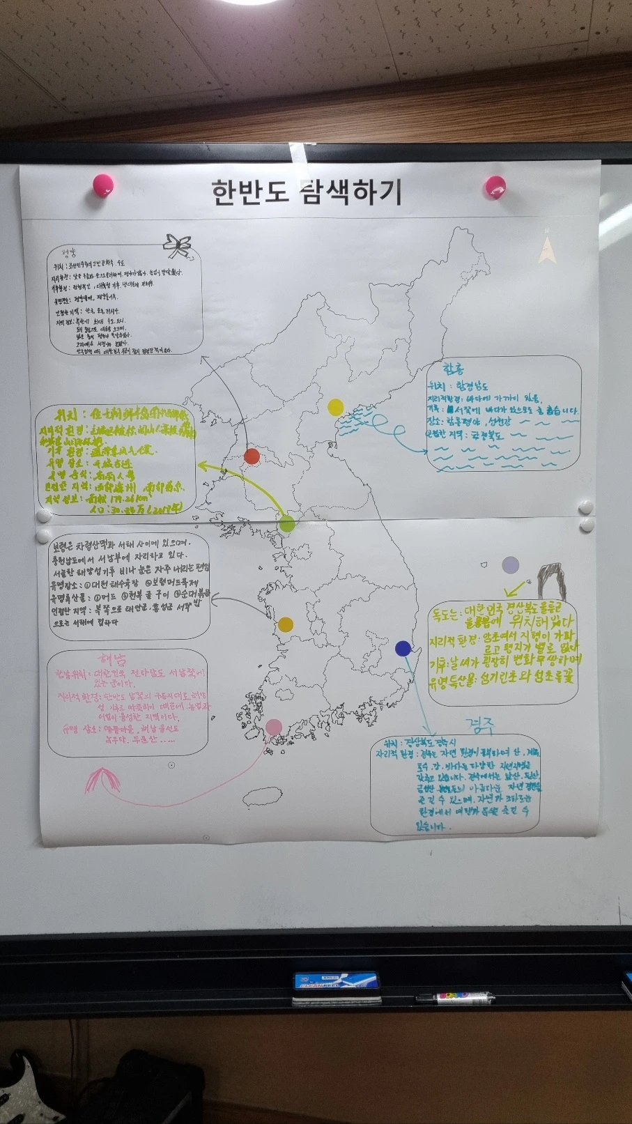 모두 정성스럽게 채워줘서 알록달록한 지도를 완성할 수 있었다. 서울, 부산, 제주도와 같이 유명한 지역 이외에도 한국에는 매력적인 곳들이 많다는 인상이 남겨졌길 바란다.