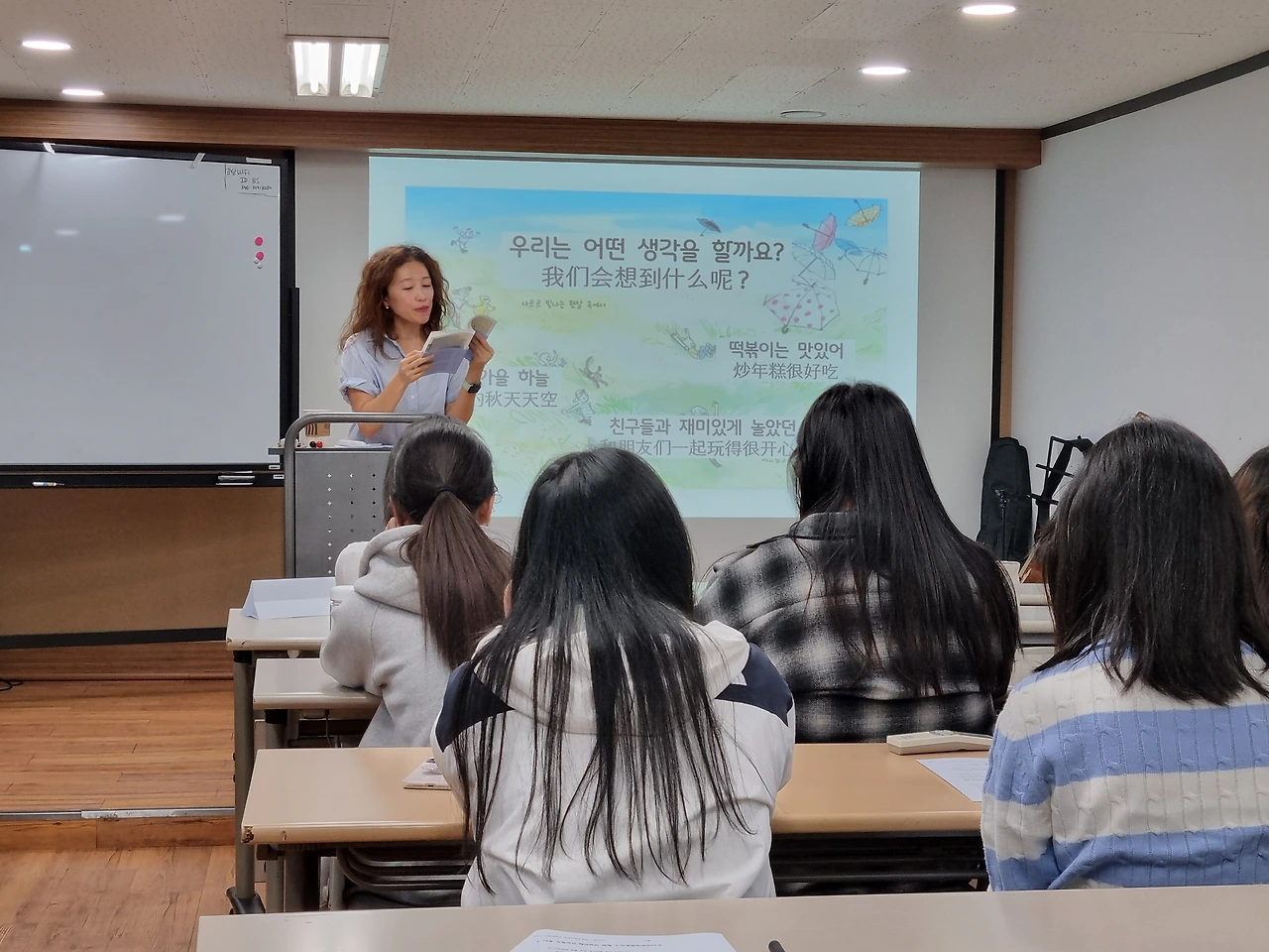이어서 학생들이 자기가 가장 좋아하는 음식을 소개하면서 그 음식과 관련된 이야기를 말했는데 중국에 살았을 때 친구들이랑 양꼬치집에서 재미있는 시간을 보냈던 기억, 어묵을 좋아하는데 어묵은 모양이 귀여우며 조리법이 다양한 음식이라는 소개, 엄마의 사랑이 듬뿍 들어간 김치볶음밥에서 행복함이라는 감정이 떠오른다는 이야기 등 따스하고 공감 가는 이야기를 많이 들었다.