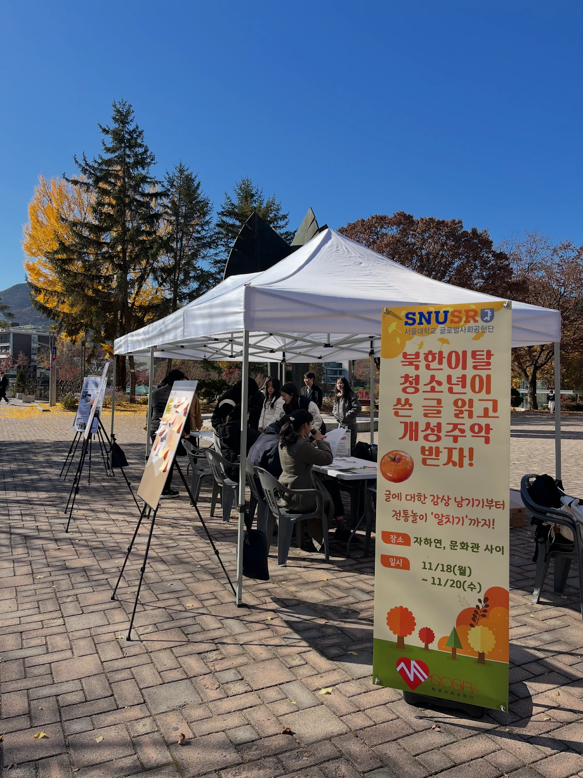 어느새 시간이 흘러 하나둘 두꺼운 외투를 꺼내 입기 시작하는 겨울이 다가왔습니다. 11월 18일에서 20일까지 저희 북소리 팀은 북한이탈청소년들의 글이 가지는 인식개선 효과를 검토하고 북소리팀의 활동을 홍보하고자 교내 잔디광장 근처에서 학내 구성원들을 대상으로 체험 부스를 운영했습니다.