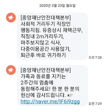 그러다 아래 url로 보이는 링크가 궁금해 눌러보았는데 질병관리본부의 네이버 포스트였다. '강도 높은 사회적 거리두기, 직장인 여러분의 동참이 필요합니다!'라는 제목의 컨텐츠. 문자보다 좀 더 자세한 지침을 친절하게 설명하고 있는 내용이었다.