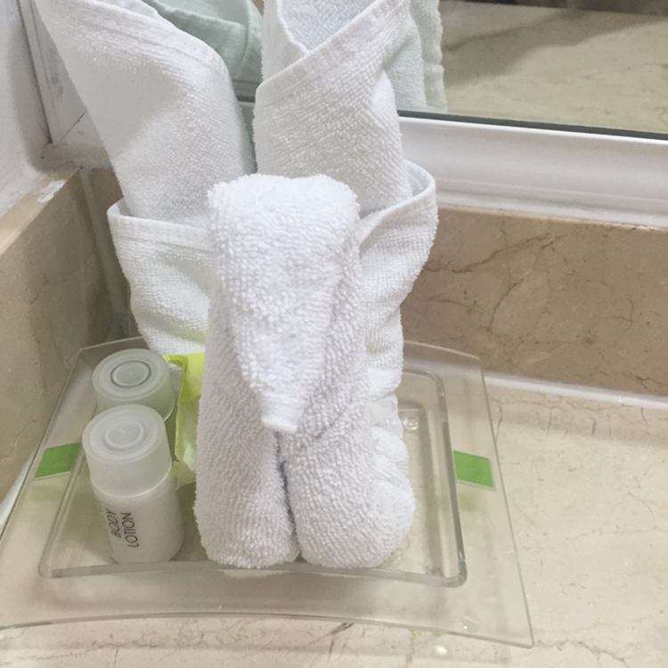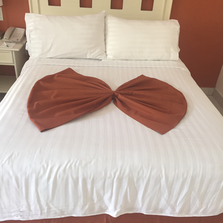 그리고 팁에 대해 꽤 고마웠다는 걸 표현하려 한 건지는 몰라도 침대에는 전 날과 다르게 커다른 리본 표시와 화장대 쪽엔 수건으로 만든 학이 정갈스레 놓여져 있었다.