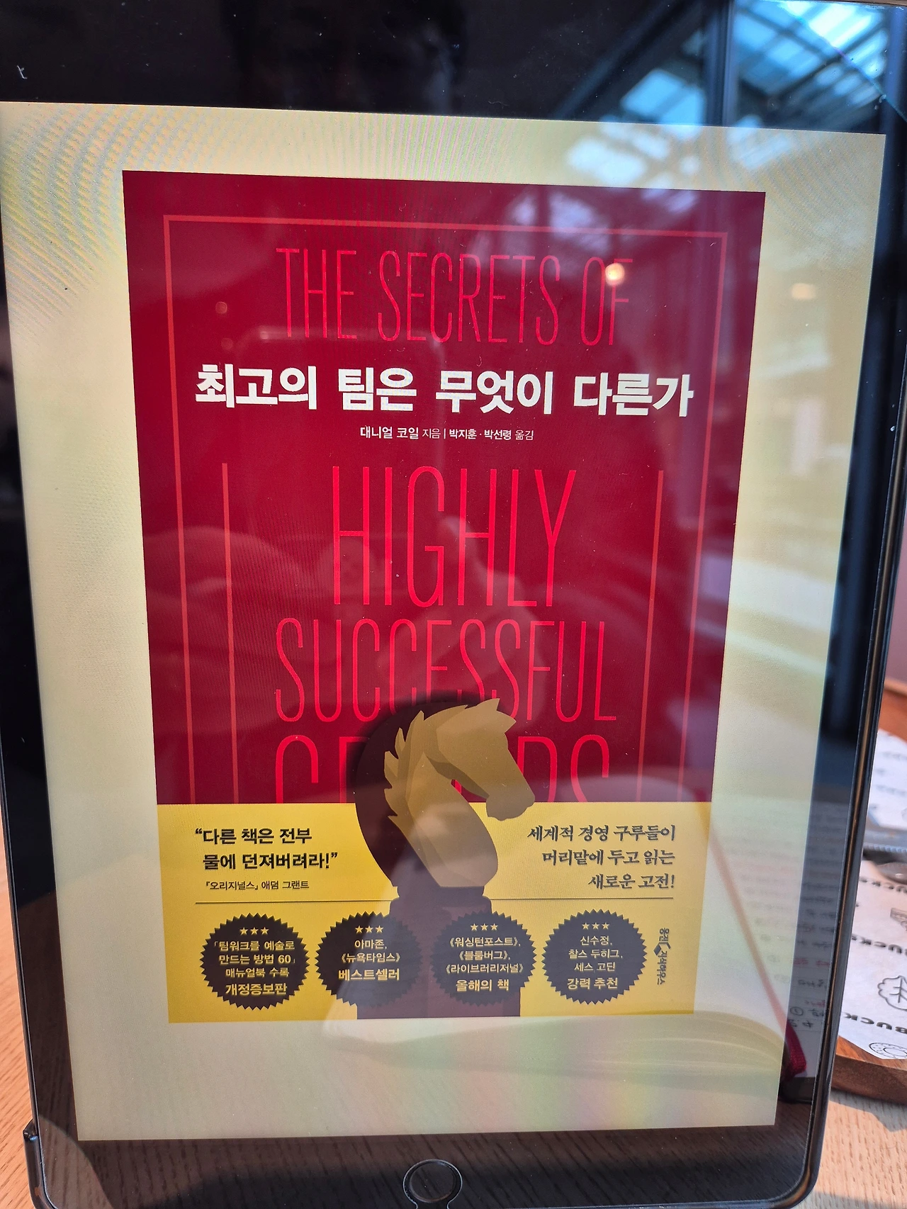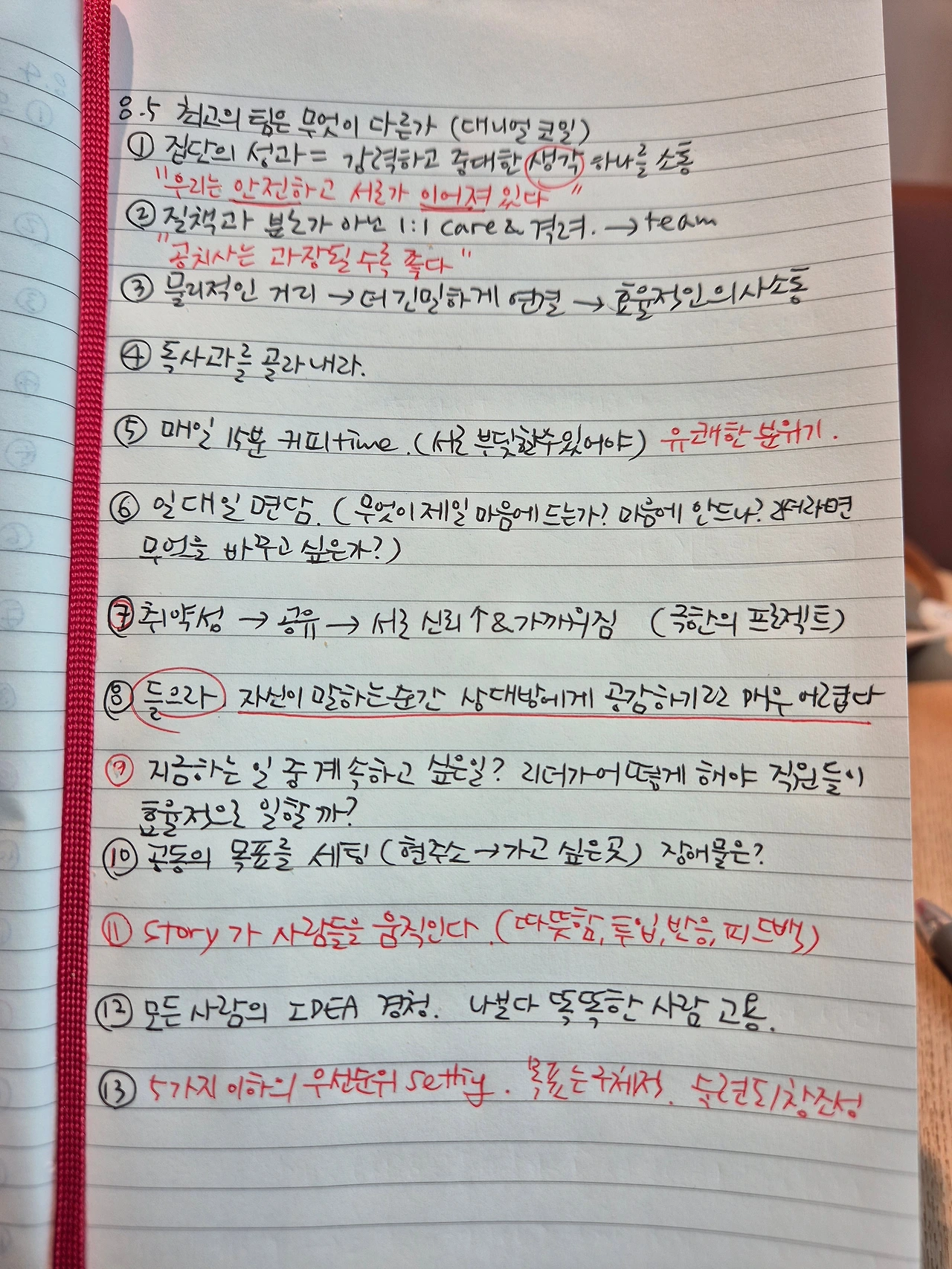 (8월 5일) 최고의 팀은 무엇이 다른가?(대니얼 코일 저)1. 집단의 성과에는 강력하고 중대한 생각 하나가 있다. 우리는 '안전'하고 서로가 '이어져'있다는 것이다.2. 공치사는 과장될수록 좋다. (리더는 질책과 분노가 아닌 1:1 care와 격려를 하는 사람이다.)3. 어려움과 취약한 부분을 공유할 때 서로 신뢰하고 가까워진다. (극한의 프로젝트)