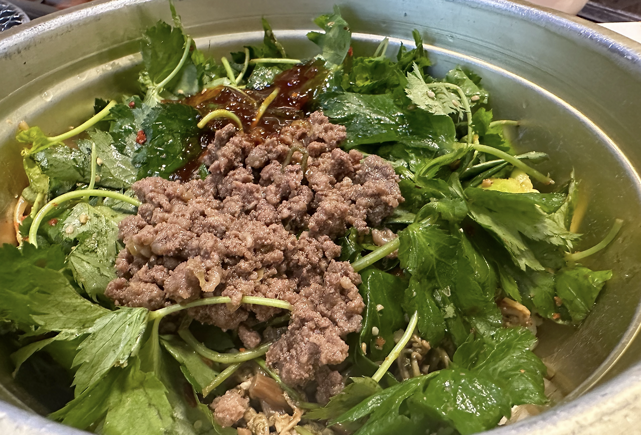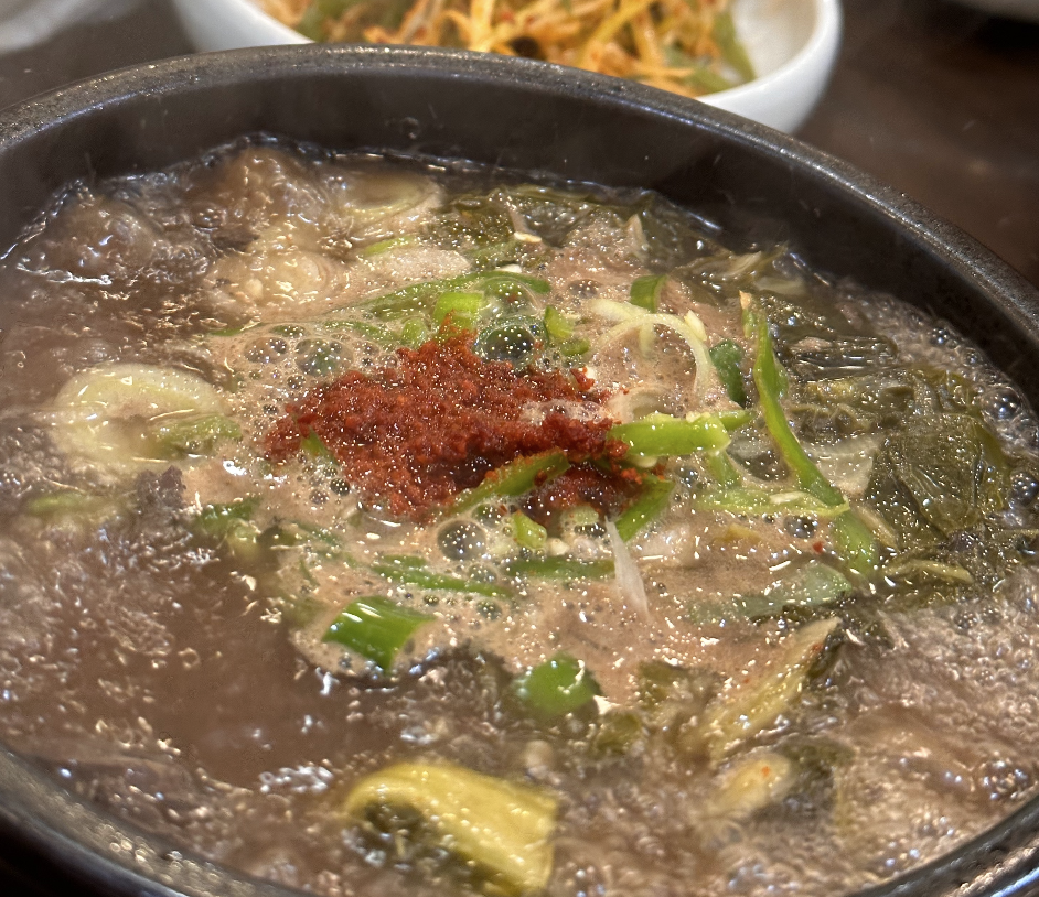 부글부글 끓어오르는 선지해장국은 간을 다스리고, 삼겹은 거들었으며, 무채는 포장하고픈 맛