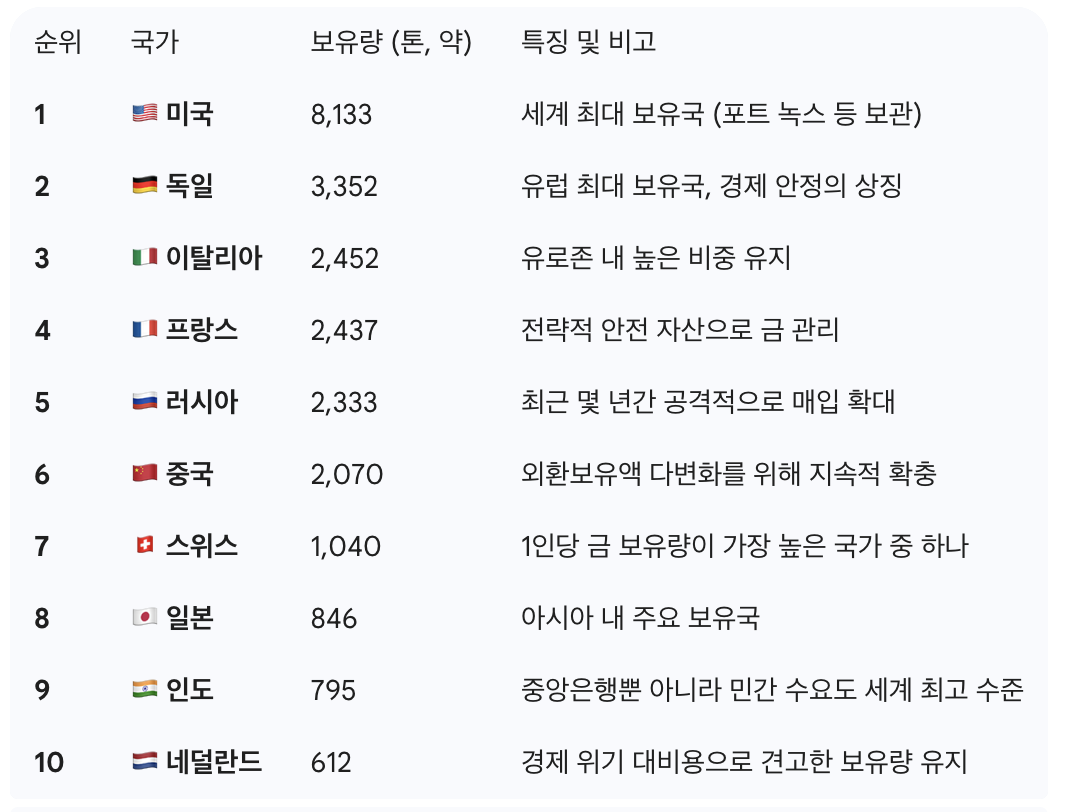 이 순위만 보더라도 미국은 세계에서 가장 많은 양의 금을 보유하고 있어. 어찌 보면 안전자산을 확보하기 위한 대외 전쟁을 치러 장기적으로