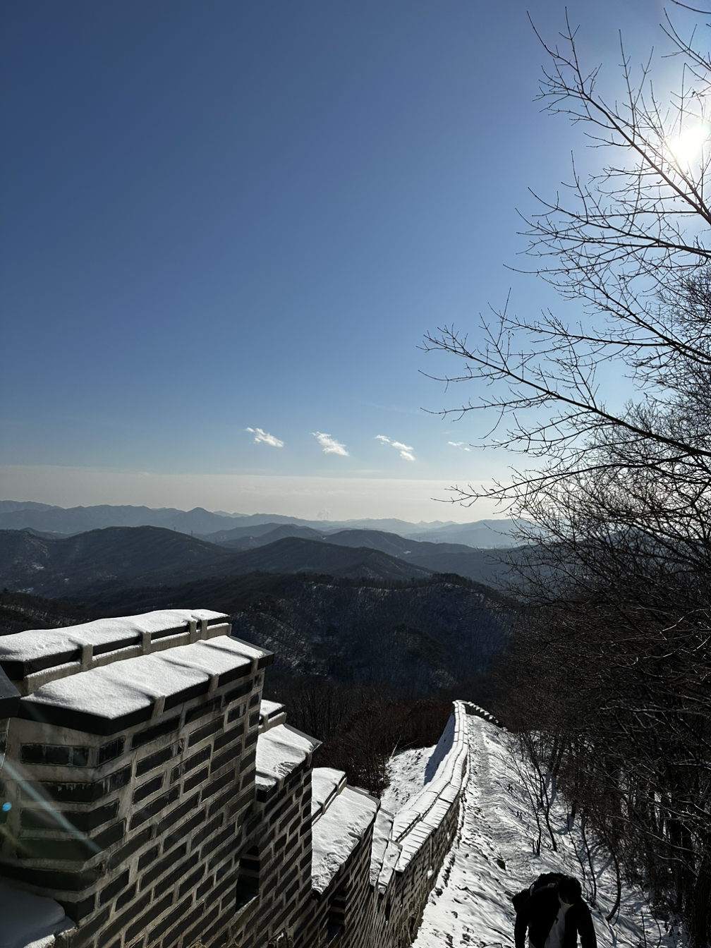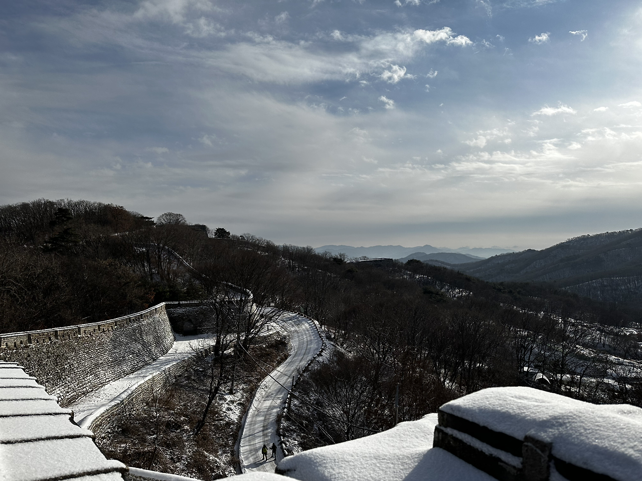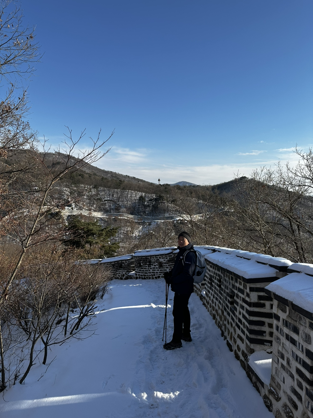 베이스 레이어, 긴팔 등산 셔츠, 플리스, 방풍의 네 겹이나 껴입은 상의에 32L 등산 가방 안엔 덕다운 라이트 재킷까지 챙길 정도로 춥다. 특히나 남한 산성 분지 같은 성곽길을 걷다 보면 예상보다 바람은 매섭고, 남북문은 특히나 응달.