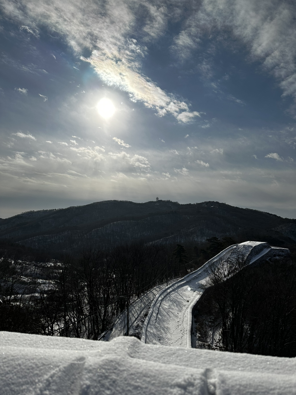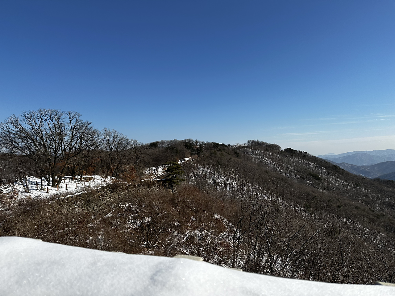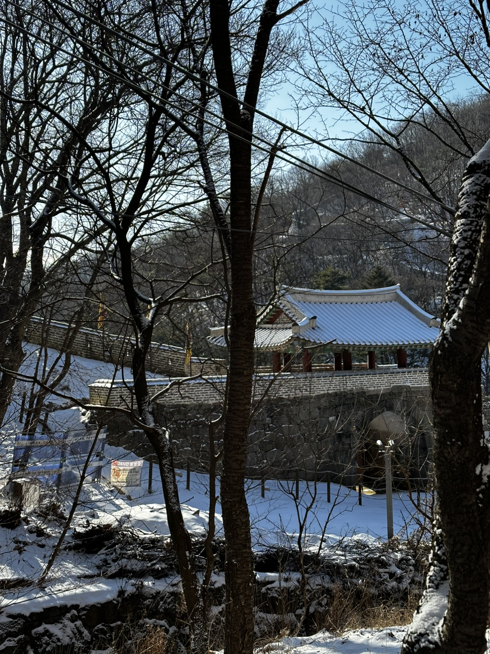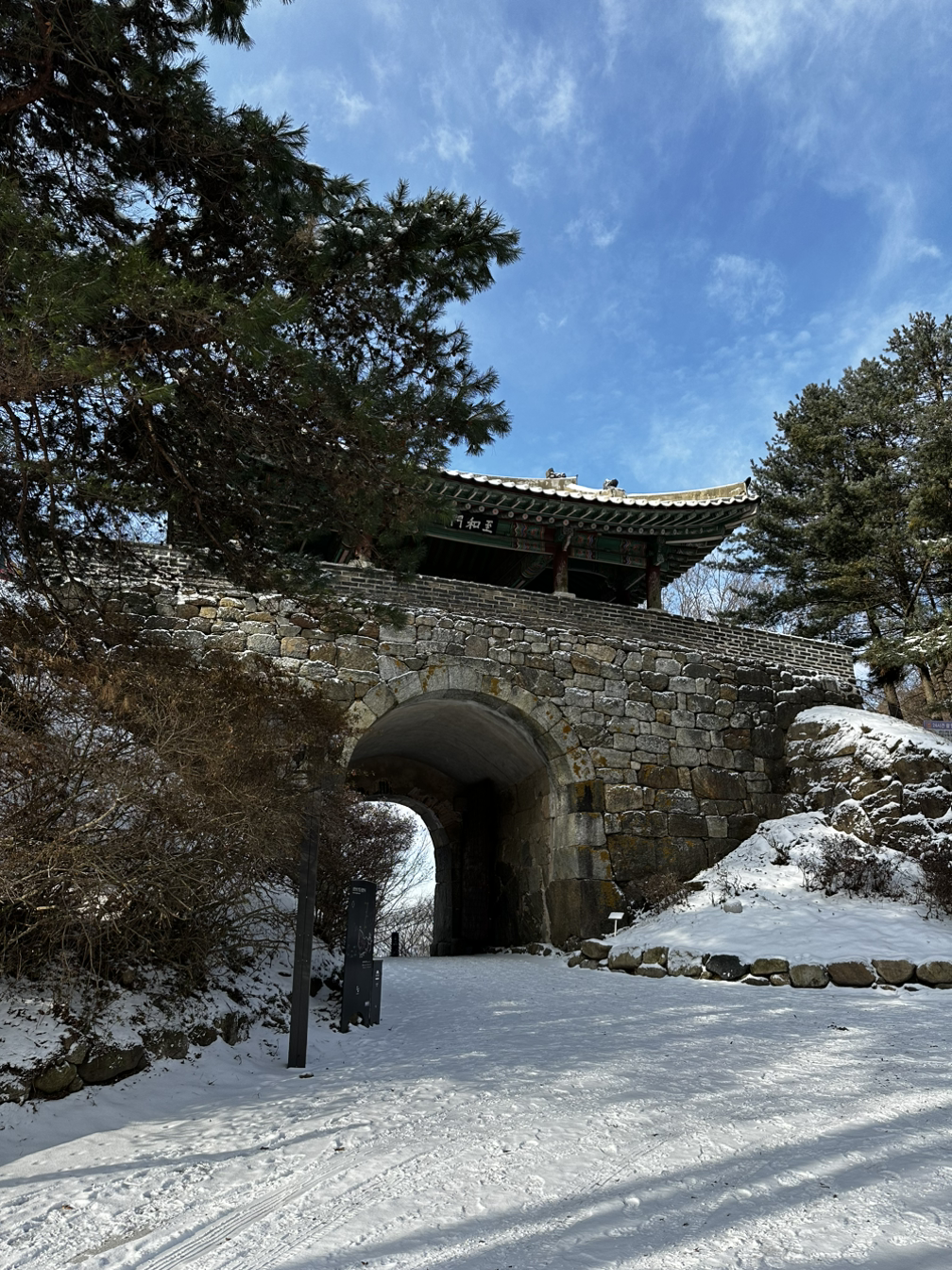 베이스 레이어, 긴팔 등산 셔츠, 플리스, 방풍의 네 겹이나 껴입은 상의에 32L 등산 가방 안엔 덕다운 라이트 재킷까지 챙길 정도로 춥다. 특히나 남한 산성 분지 같은 성곽길을 걷다 보면 예상보다 바람은 매섭고, 남북문은 특히나 응달.