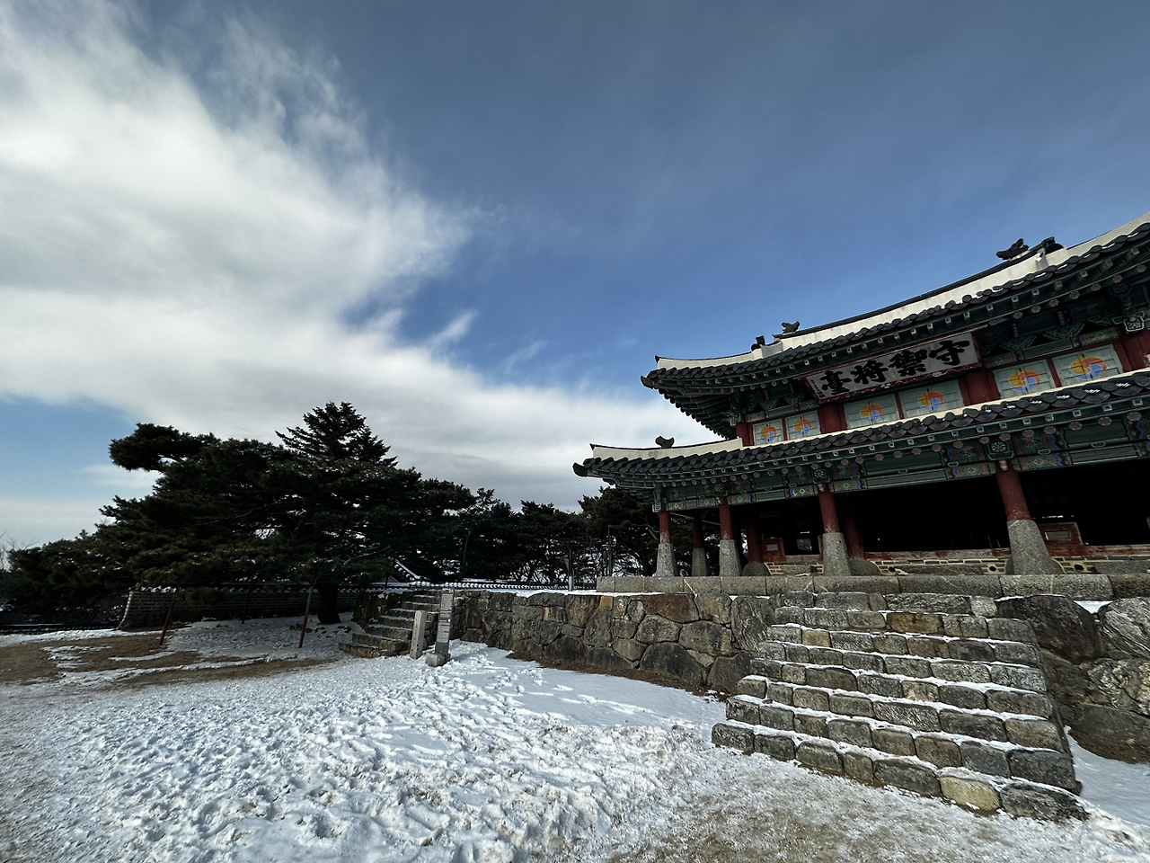 아침 일찍부터 눈이 내리고 수북이 쌓였다. 며칠 전 내린 눈에 덧쌓인 눈은 걷기에 버거울 수준. 해서 들산 지화문(남문)부터 아이젠을 착용하고 출발한다. 밟히는 눈에서 소복소복 소리가 나니 초입부터 즐겁다.