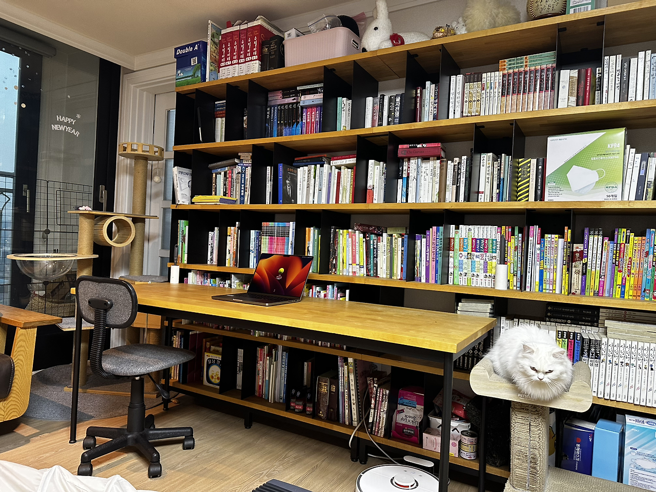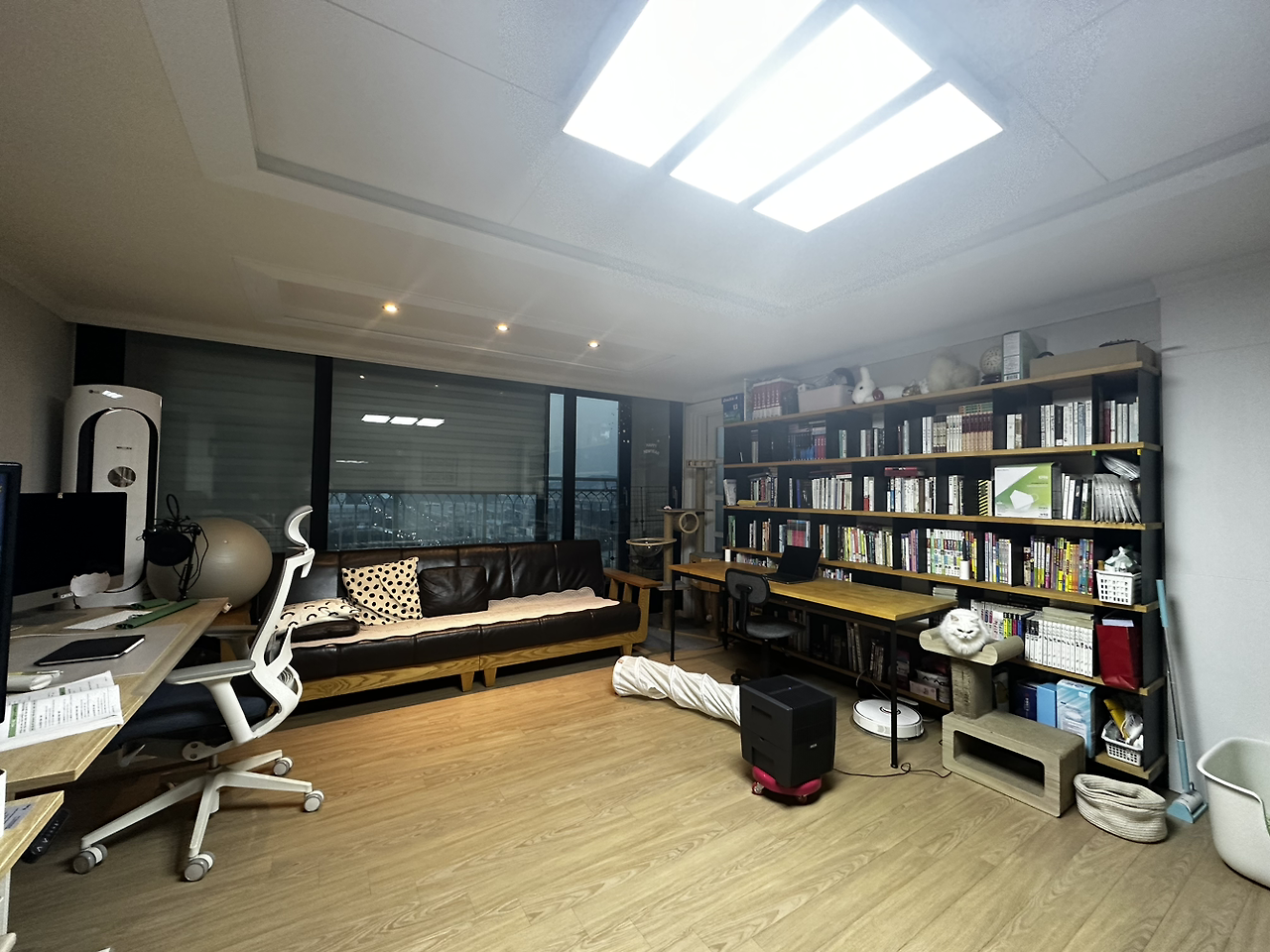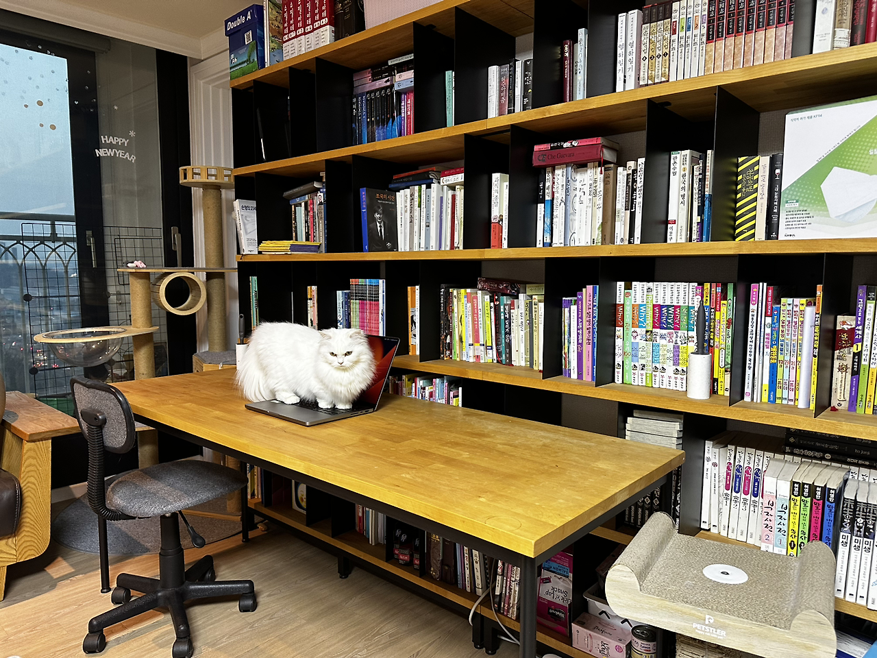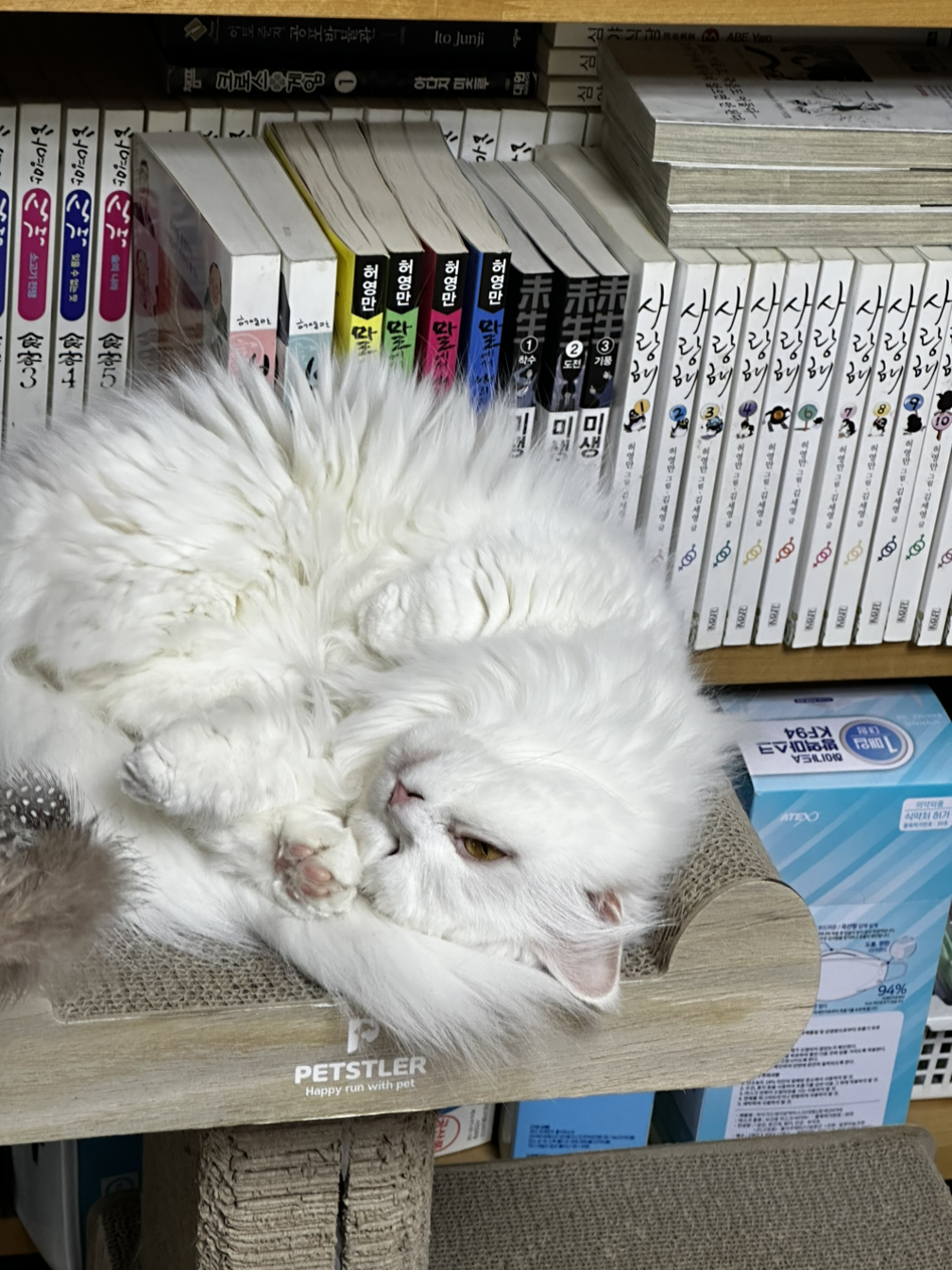 가족 모두가 만족하고 있다. 그럼에도 불구하고 가족 중 가장 거대한 수혜. 최대의 수혜자는 다름 아닌 보리다. 보리는 거실의 책장에서 소파를 거쳐 책상으로 이어지는 ㄷ 자형 동선을 모두 확보했다. 자신의 늠름한 캣. 워. 크. 동선을 말이다. 이 녀석 이제 거침없이 행차한다. 동선 중 그 발걸음을 막는 물건이 있다면 도도하게 밟고 넘는다. 온 가족이 머무는 시간이 거실에 집중되면서 이 녀석의 잠과 자태는 더욱 편안해졌다. 숨을 공간은 작은 방들로 다녀오면 될 뿐.