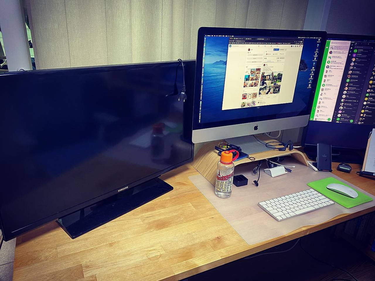 (별 시답잖은 이야기이지만) 작업 공간의 스크린은 네 개. 메인 장비+멀티모니터+TV+노트북 콤보스크린. 하는 일이 인터넷 서비스 쟁이니니. 클라이언트와 서버 사이 결과물 확인 뿐만 아니라, wiki등 eLog 지식관리 툴의 데이터 적재(그림 등) 결과 확인을 위해 노트북이 필요할 경우도 많다.