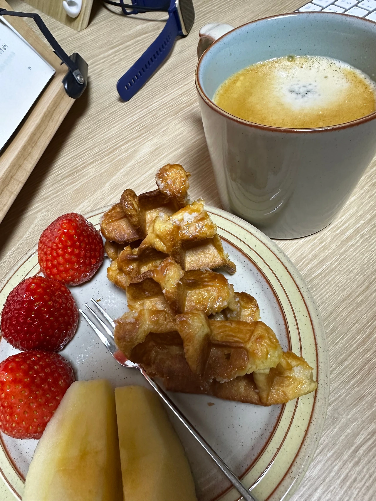 일어나면 가장 먼저 하는 일. 잠들 기 전 준비해 사용했던 물통을 책상위에 올려두고, 커피머신으로 직행. 기계로 내려 먹는 커피라 맛은 우라질. 하지만 이른아침 식사와 함께 하는 커피 한 잔이 난 그렇게 좋을 수 없다. 더불어, 과일/모닝롤을 필두로 밀가루 반죽(?)하나/가끔 만두? 정도의 어설픈 에피타이저 구성으로 아침을 준비한다.(물론 아내가 해주는 아침은 수준이 다르지만. 내 나름대론 이 구성에도 충분!)