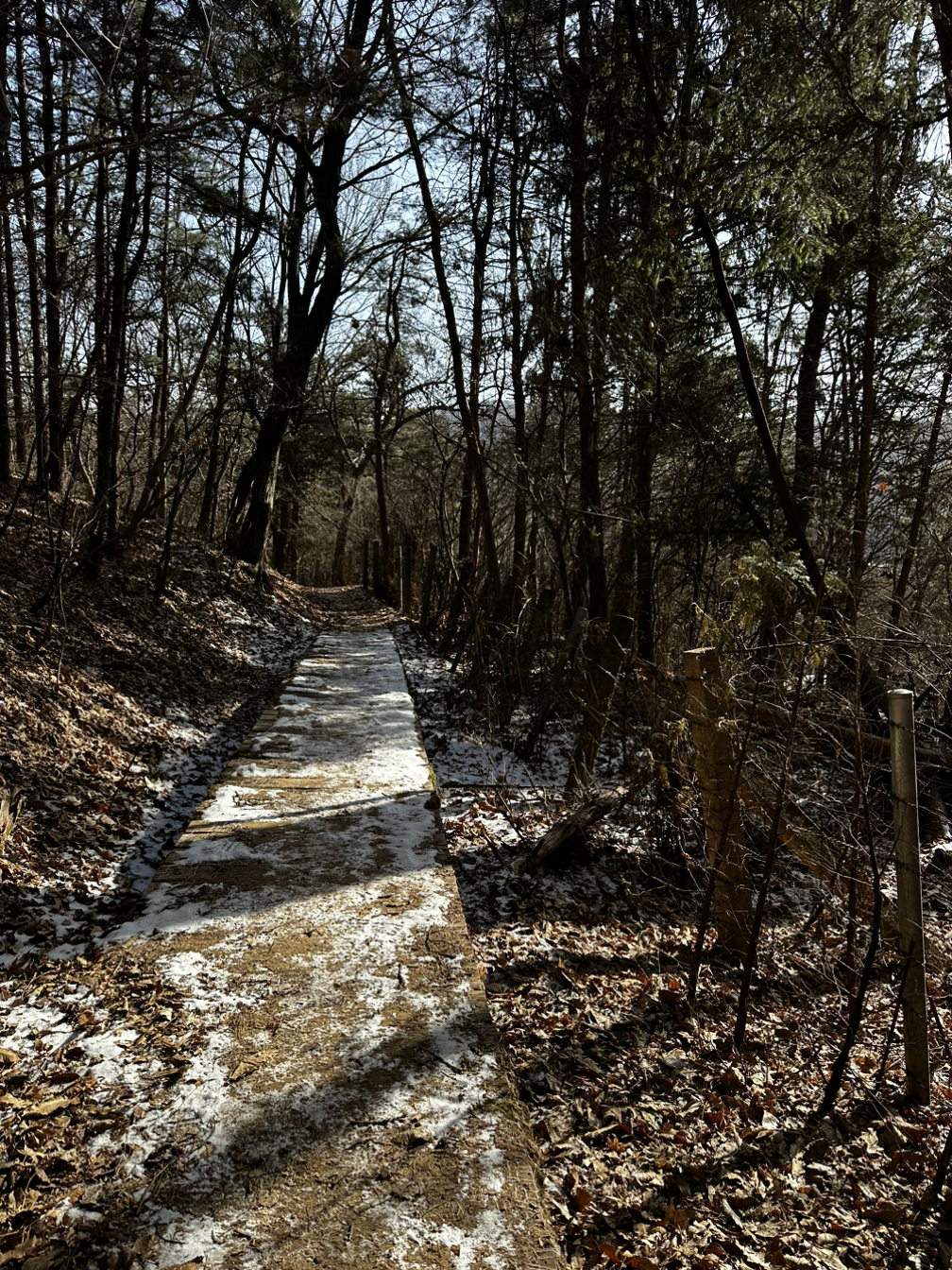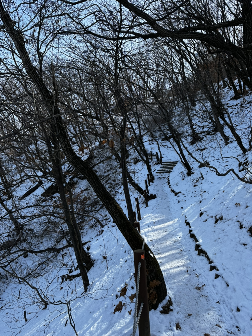 해가 온전히 내리쬐는 국사봉에서 하오고개로의 하산길은 마른 흙이다. 내려오기 전 착용했던 아이젠을 벗어 놓고 나니 걷기에 훨씬 수월하다.