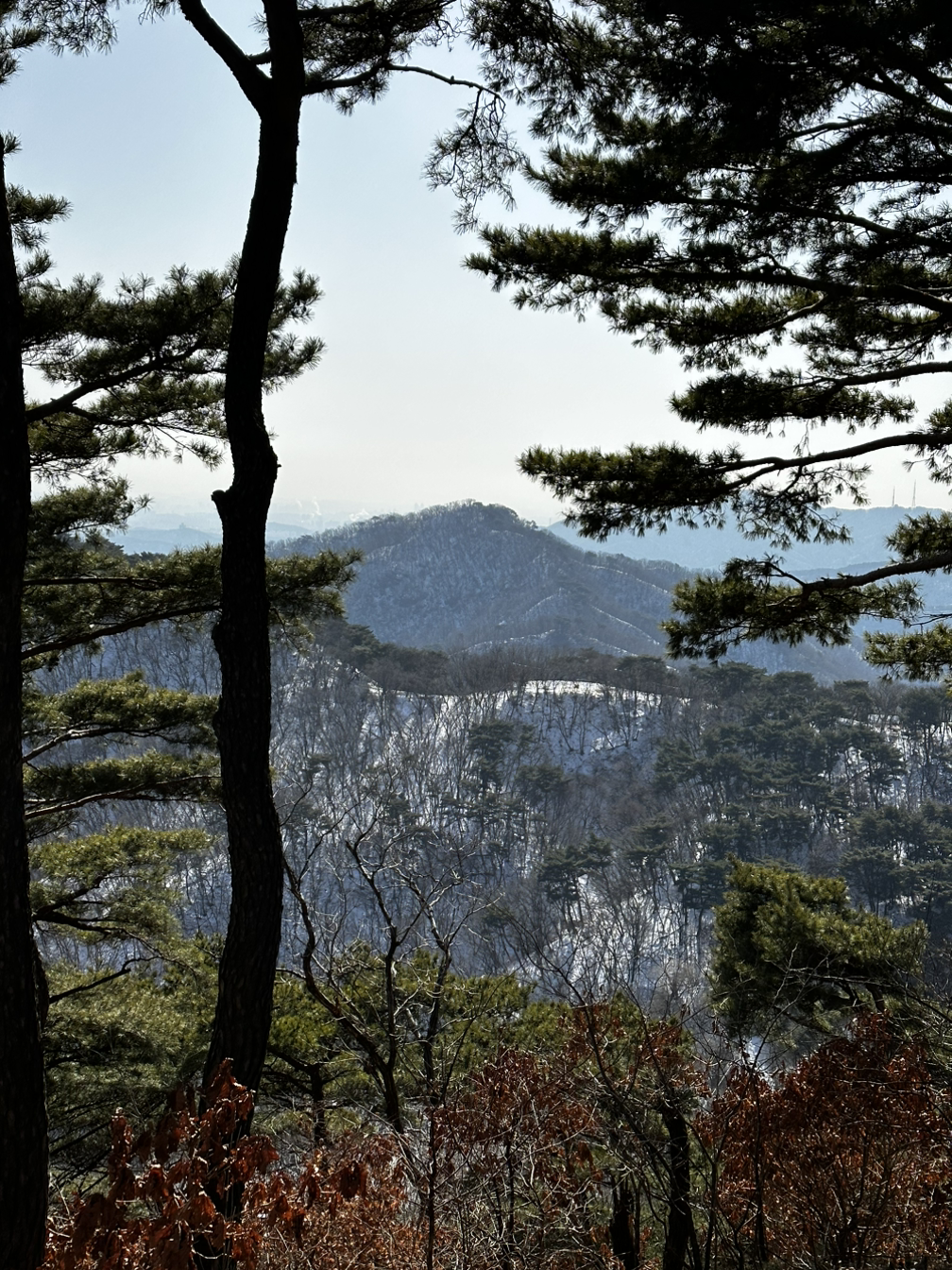 소나무 사이로 보이는 국사봉까지의 능선엔 하얀 눈이 덮여 아름답기 그지없다. 내가 좋아하는 이수에서 국사 능선은 진달래 피는 봄이 더 좋지만 한 겨울의 눈 쌓인 모습도 이렇게 좋을 수가 없다. 만나는 사람도. 나도. 눈도. 소나무도. 모두가 좋은 시간.
