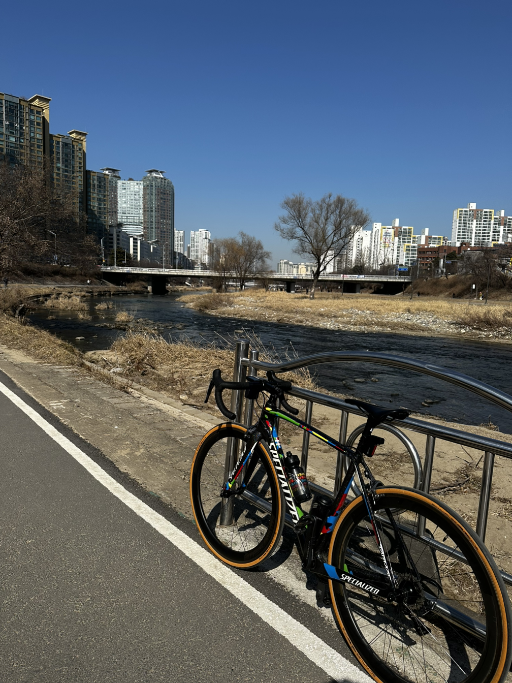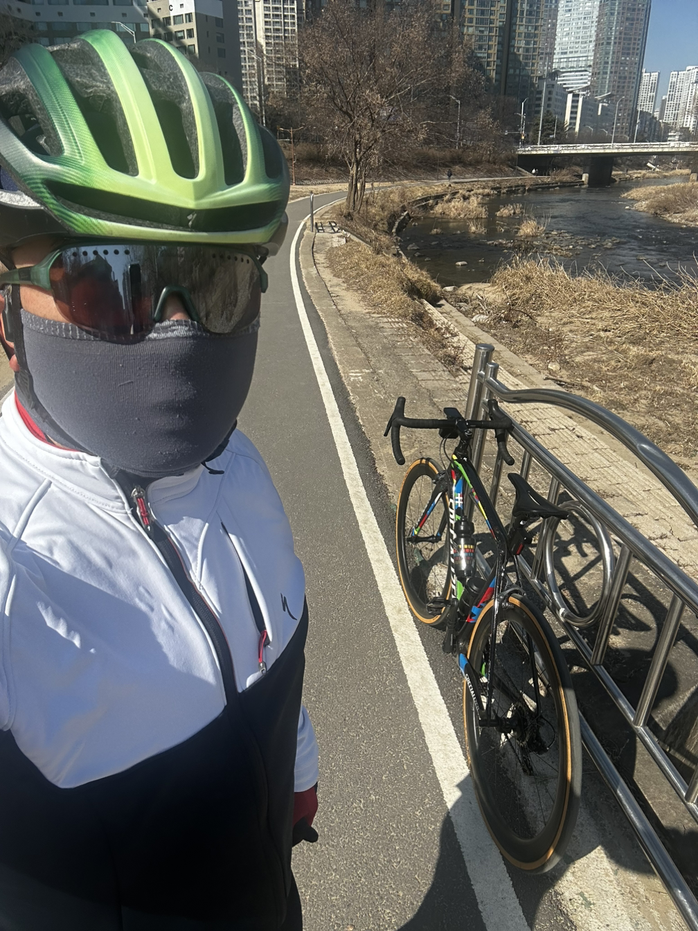 복장: 에스웍 헬멧/클릿 슈즈, 인캡, 라파 동계져지, 스페셜라이즈드 동계재킷, 스파이더 롱빕, RB 동계용 슈커버, 수티스미스 양말