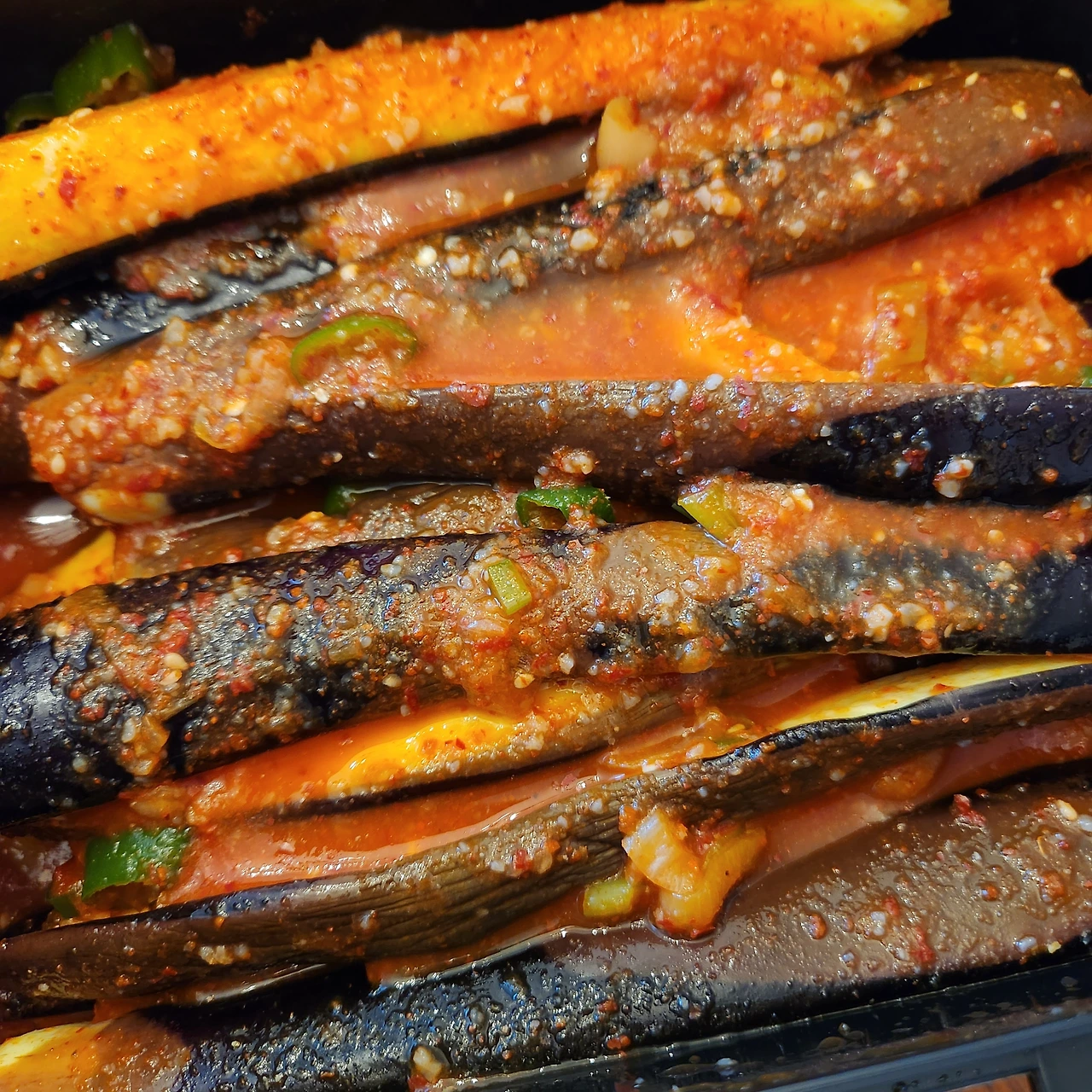 이렇게 자른 가지를 찜기에 쪄주는데 여기서 시간이 오버되면 물러지니 주위가 필요하단다. 2분 30초만 찌라고 주의를 줬으나 결과물을 보니 대략 3~4분 정도는 쪄야 적당할 것 같다. 찐 가지를 소금이 아닌 액젓을 이용해 30분 정도 절여주는데 이때 잘 섞어주어야 골고루 절여진다. 절여지는 동안 양념이 될 재료들을 썰고 믹서에 갈아서 버무릴 준비를 해둬야 하는데 준비할 것이 홍고추, 양파, 식혀 둔 밥 등이다. 밀가루나 찹쌀풀 대신 이렇게 찬밥을 갈아서 쓰니 한결 간편해서 좋다. 큰 그릇에 믹서에 넣고 간 것들을 쏟아붓고 고춧가루와 마늘, 청양고추, 대파 등 첨가하여 절여진 가지를 넣어 잘 버무려 섞어주면 이제 거의 다 왔다.
