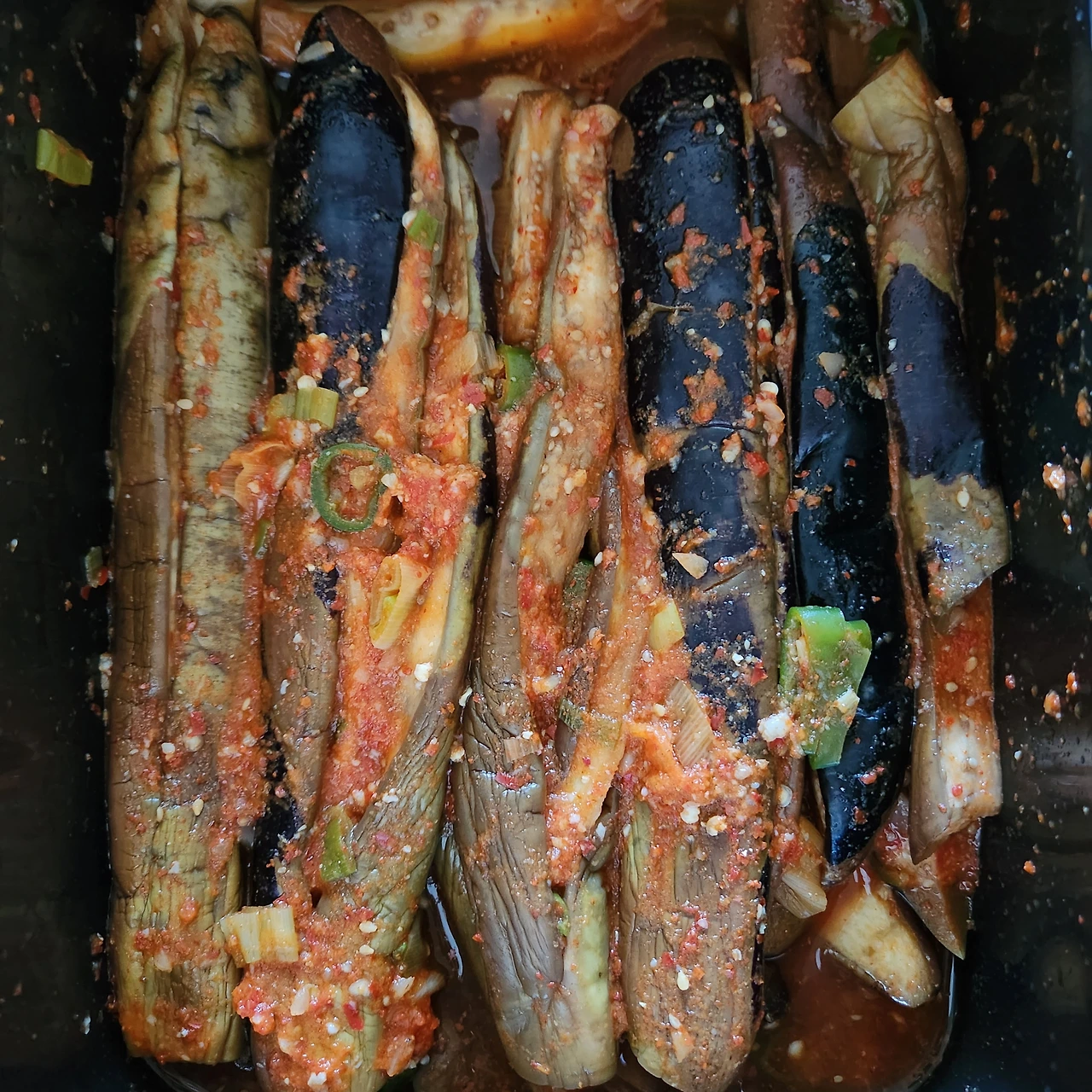 양념옷을 입은 가지를 김치통에 담아 실온에서 익혀주는데 대략 하루 정도 실온에 뒀다 냉장고에 넣으니 적당하다. 익기 전에 한 입 먹어보니 싱겁다는 느낌이 들었지만 다음 날 다시 먹어보니 짠맛이 골고루 배어 오히려 조금 짠 느낌이 들었다.