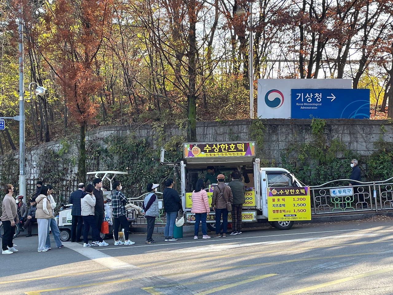 공원의 시작은 기상청이다. 보라매공원의 입구는 여러 개인데 농심 건물 옆에 있는 것이 정문이다. 정문에서 쭉 걸어 들어오다 보면 어렵지 않게 기상청을 찾을 수 있다. 그리고 그날 운이 좋다면 옆에 서 있는 ‘수상한 호떡’ 트럭도 발견할 수 있을 것이다. 겨울이면 트럭 앞엔 으레 긴 줄이 늘어서곤 한다. 꿀과 치즈가 들어간 따끈한 호떡을 한 손에 들고, 다른 한 손엔 야쿠르트 아주머니께 산 시원한 요구르트를 들고 있으면 세상을 다 얻은 것 같다. 기상청 앞에서 간단히 허기를 채우고 본격적으로 보라매공원을 산책해 본다.