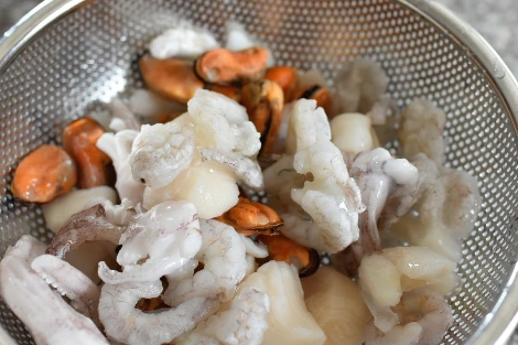 1. 냉동 해물 모듬을 찬물에 담가 해동한다. (미리 해동할 필요 없이 잠시 담가 두어도 된다.)