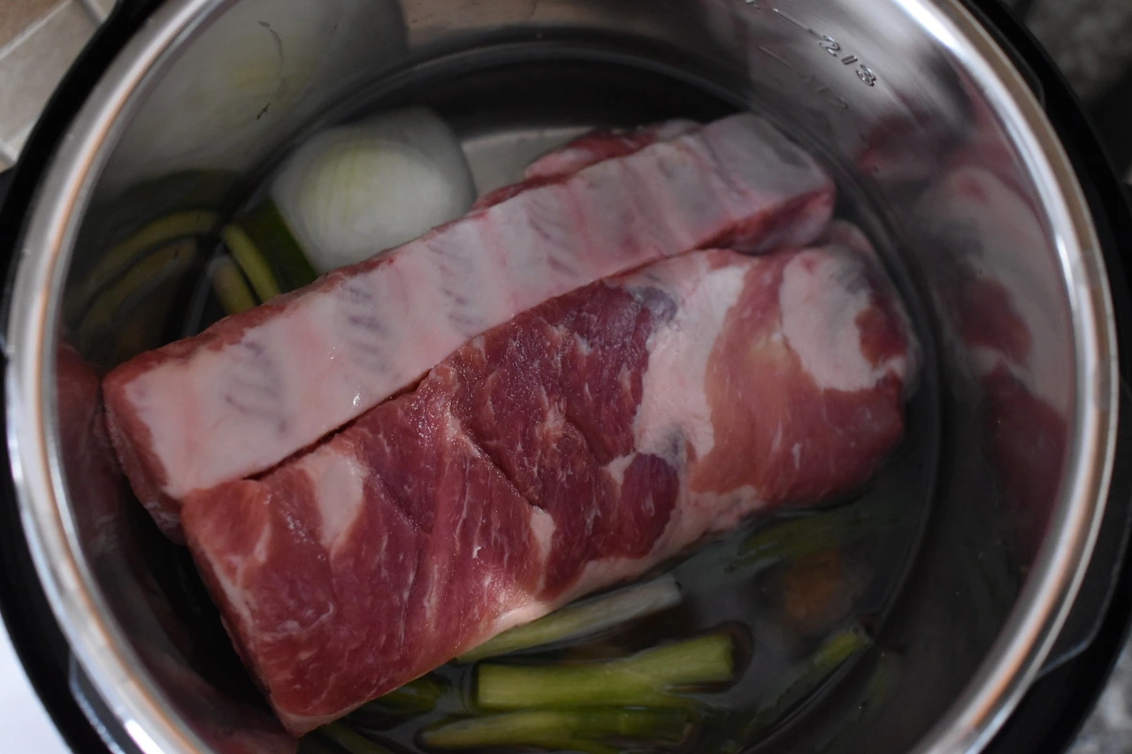 3. 인스턴트 팟에 주재료를 모두 넣고, 물은 고기가 자박하게 잠길 정도로만 넣는다. (국물 음식이 아니기 때문에 물을 많이 넣지 않는다.)