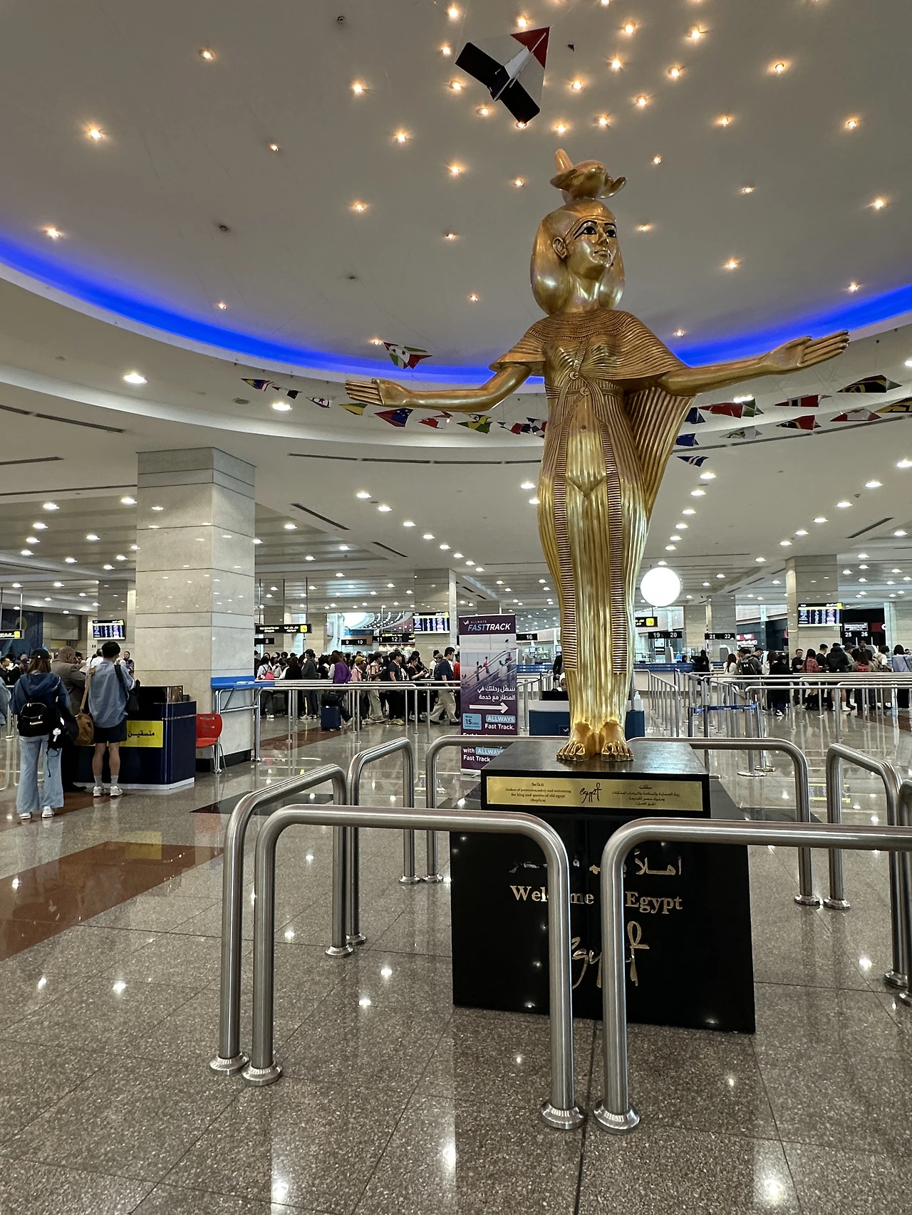 내리기 싫었던 비즈니스 석에서 겨우겨우 엉덩이를 떼고 내려 금빛 동상이 반겨주는 이집트 공항에 드디어 도착했다.