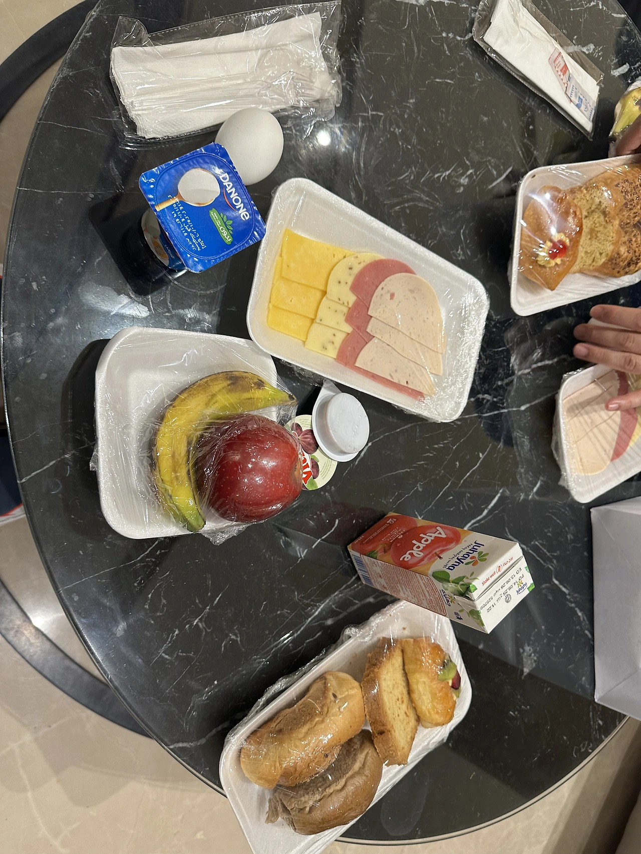 아무튼 주섬주섬 짐을 싸서 아쉬움을 뒤로 하고 1층에 내려가 체크아웃을 하고, 조식 대신 아침 도시락을 받았다. 거창하진 않았지만 그래도 있을 것은 다 있는 알찬 도시락이었다. 남은 시간 10분, 너무 이른 아침이라 잘 음식이 넘어가진 않았지만 부랴부랴 달걀과 요거트를 입에 넣고, 빵에다 치즈와 햄을 껴서 먹었다. 주스와 과일은 혹시 배고플지도 모르니 가방안에 넣었다.