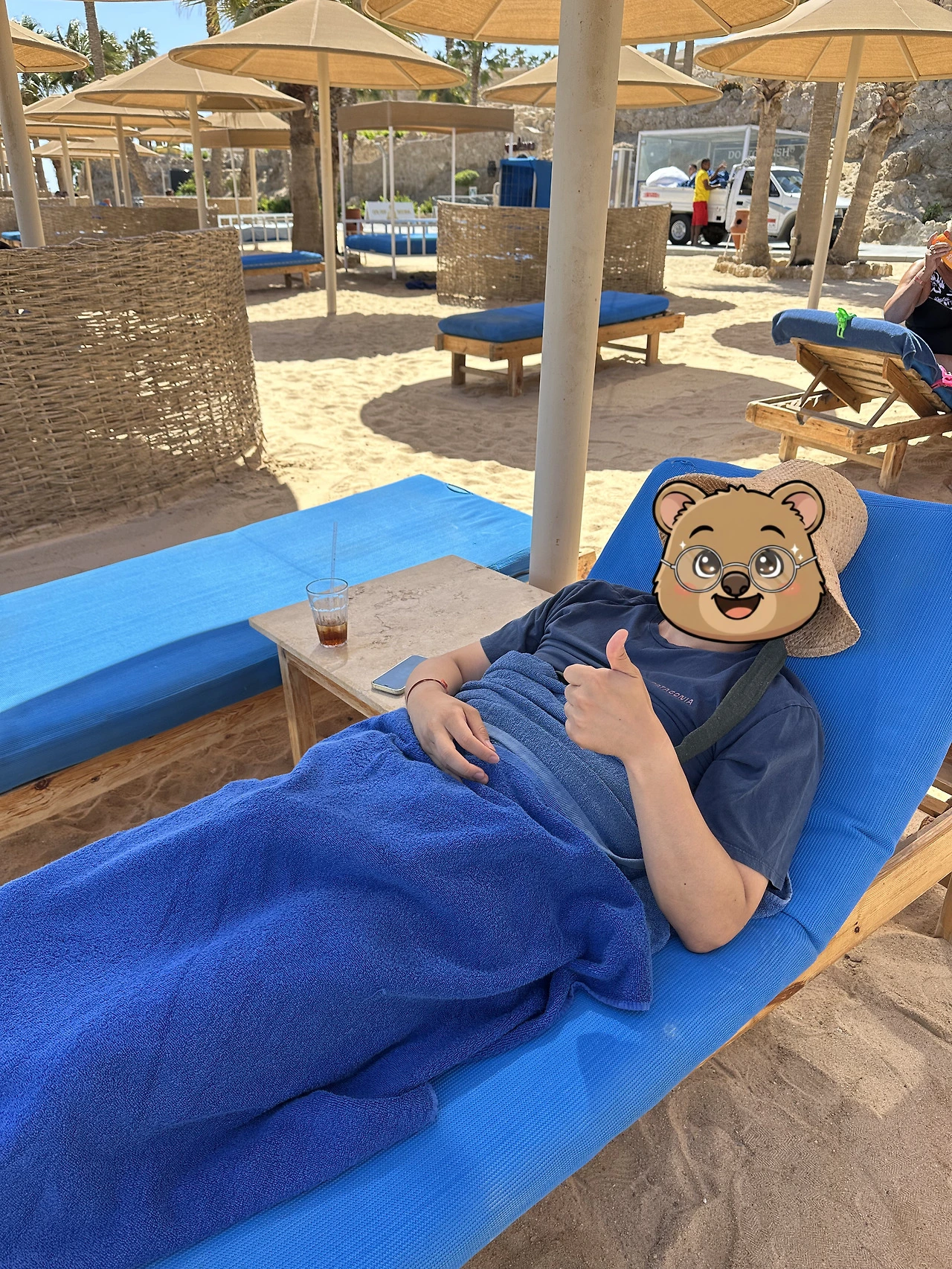 밖으로 걸어나와 샤워로 바닷물을 씻어냈다. 홍해의 바닷물은 정말 짰는데, 그 강한 염도만큼 몸에 더 찐득하게 달라 붙는 느낌이었다. 샤워 후 나른한 몸을 선베드에 누이고, 인근 바에서 받은 모히또(물론 무료다)를 한모금 하고 눈을 살짝 감으니 이 곳이 정말 천국 같았다.