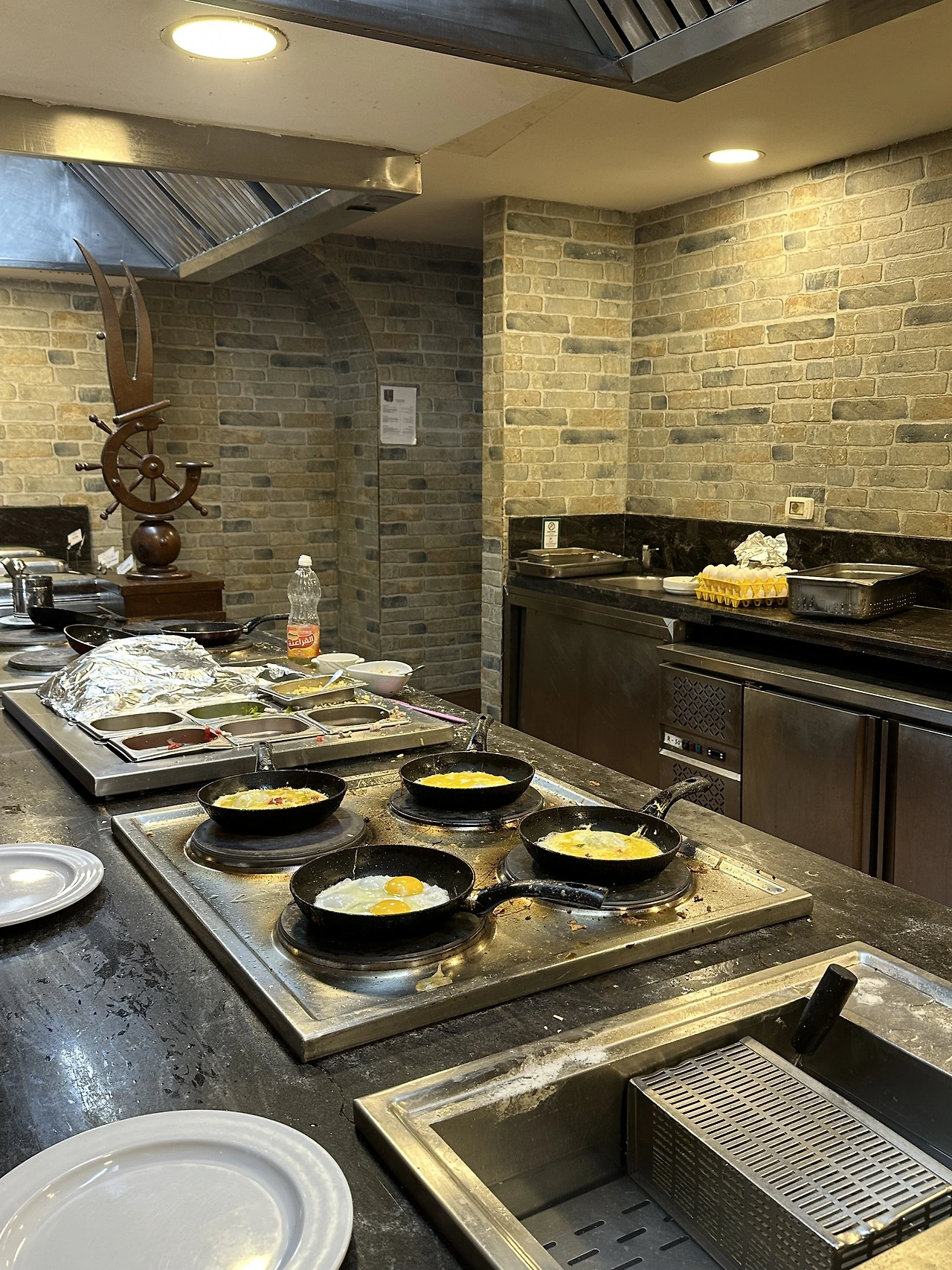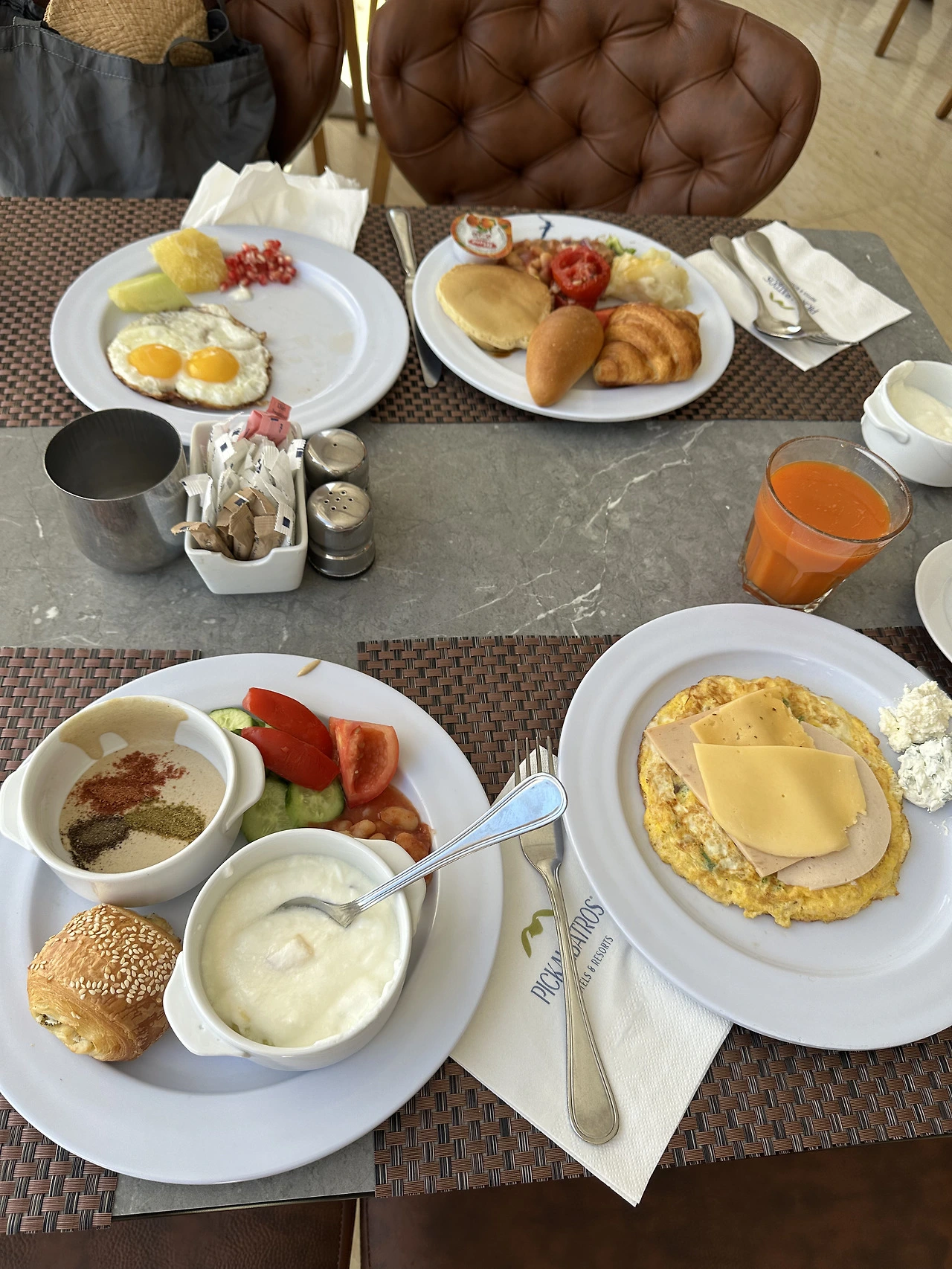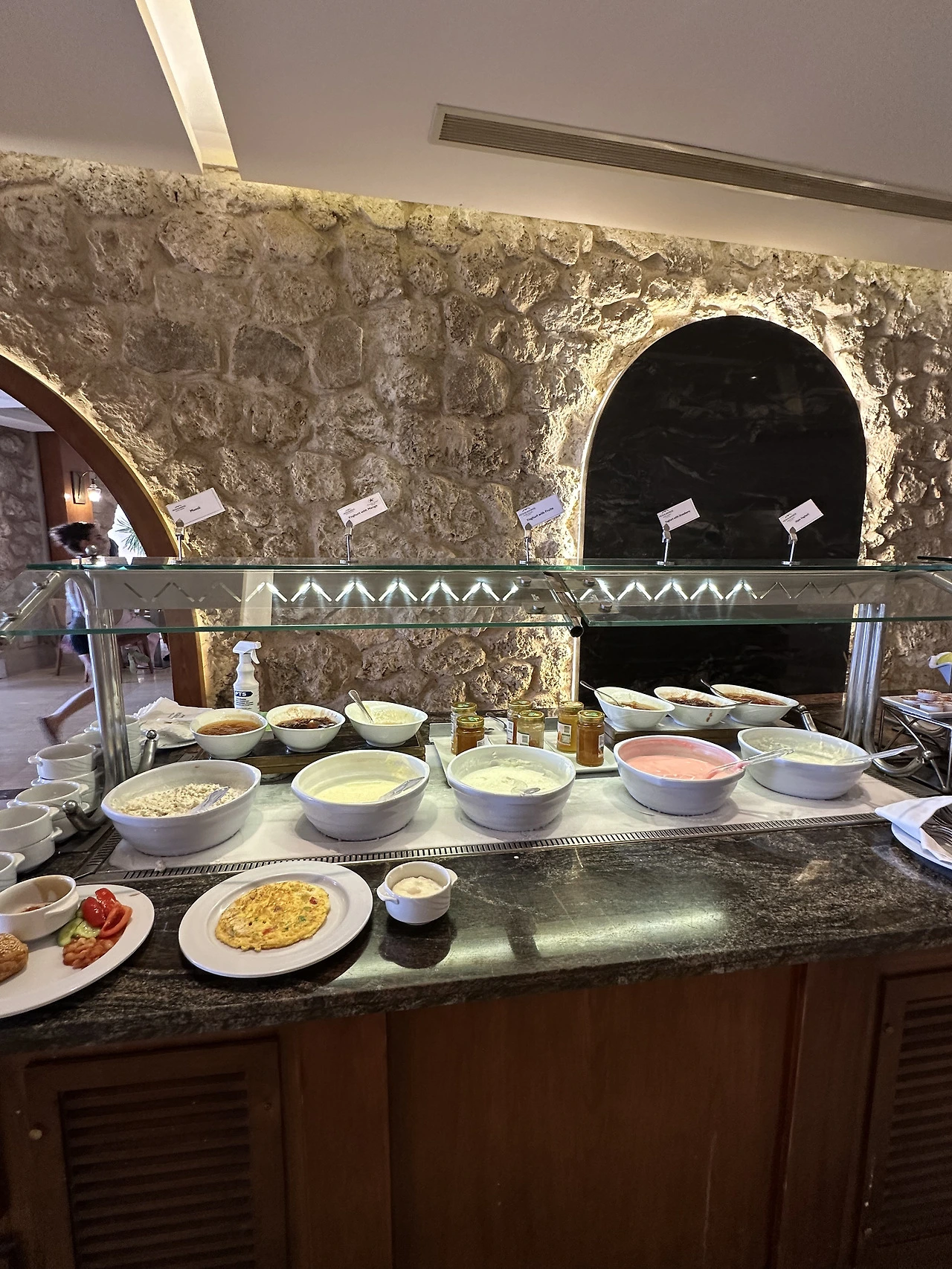 아침의 알프레도 식당은 그 어느때보다 북적였는데, 한번에 4개의 후라이팬을 소화하는 화려한 스킬을 보여주셨던 요리사님이 압권이었다. 다른 식사 타임에 비해 종류가 더 풍부해진 느낌이었는데, 빵의 종류도 많고 요거트가 여러 맛으로 있어서 구경하는 재미가 쏠쏠했다. 그리고 이집트 답게 후무스도 한켠에 있어서 빵을 찍어먹어봤는데 짭잘하고 고소해서 별미였다. 처음에 아스완에서 계란전 같은 오믈렛을 보고 웃었는데, 이번에도 그렇게 나온 것을 보니 이쯤되면 이집트 오믈렛 스타일이 이런가보다.