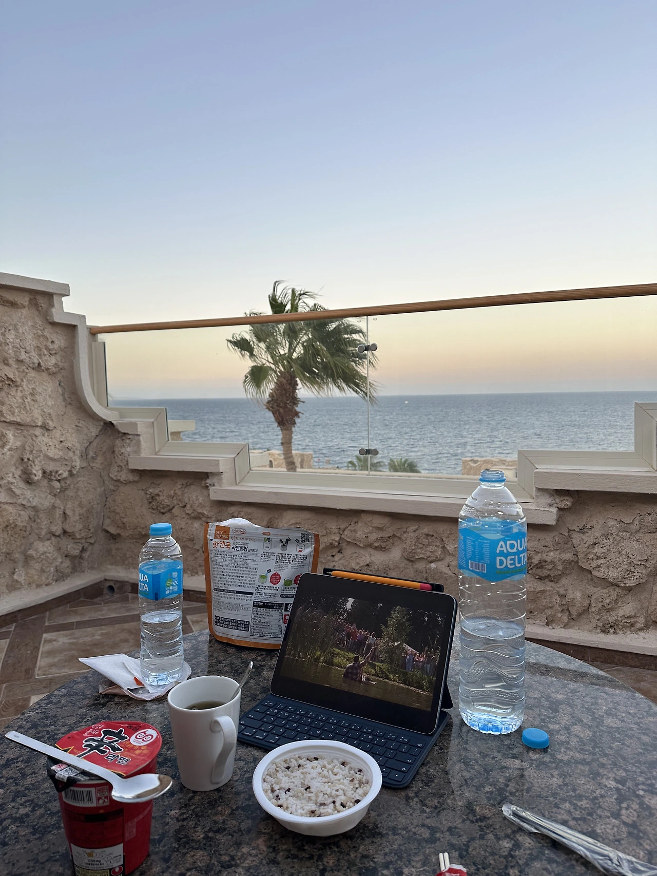 저녁으로는 아껴둔 마지막 김치찌개 라면밥과 햇반을 꺼냈다. 산행에 가서 먹는 제품인 것 같은데, 발열체가 내부에 있어 실온의 물을 넣어도 뜨끈하게 먹을 수 있다. 다만 야외에서 먹는 제품이라 연기가 좀 나는 편이어서 베란다에서 먹었다. 야자수가 보이는 먼 바다에서는 아스라이 그라데이션을 이루며 해가 져가고 있었고, 하루종일 수영한 후 먹는 라면과 밥이 주는 뜨끈한 국물과 탄수화물이 끝내줬다.