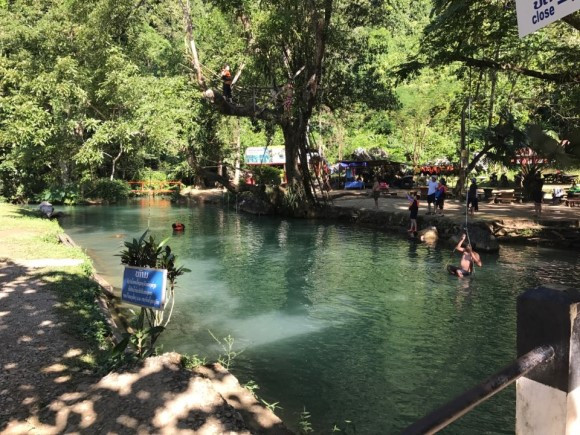 방비엥에 오면 꼭 가봐야 한다는 블루 라군으로 출발했다. 짐칸에 사람이 탈수 있는 개조 트럭으로 이동했다. 그런데 비포장도로를 덜덜 거리며 달리다가 갑자기 서행하더니 아예 정지하였다. 소떼들이 지나가는 것이다. 여기는 그야말로 개나 소나 방목이다. 마른 소들이 때론 수십 마리가 줄지어 길 한복판을 휘젓거나 아예 서있기도 하였다. 운전사는 클랙슨 한번 울리지 않고 기다린다. 모든 것이 정지하여 있는 순간, 덕분에 푸른 하늘에 뭉게구름이 피어있고 경치 좋은 산세에 한적한 도로 위로 소가 어슬렁 지나가는 풍경을 감상할 수 있었다. 그 자체만으로도 힐링이었다. 카약이 쌓여있고 짚라인을 탄다거나 동굴 탐험을 한답시고 분주한 분위기의 방비엥과는 대조적이었다.