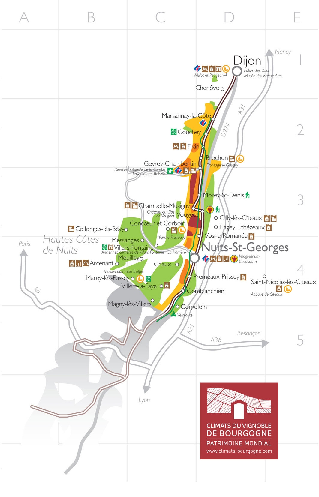 피노누아 품종으로 만든 섬세한 레드 와인이 생산되는 산지로 최상급 부르고뉴 레드 와인의 거의 대부분이 이 지역에서 만들어집니다. 대표적인 마을로는 Gevrey-Chambertin 쥬브레샴베르탱, Morey-St-Denis 모레생드니, Chambolle-Musigny 샹볼뮈지니, Vougeot 부조, Vosne-Romanee 본로마네, Nuits-St-Georges 뉘생조르주가 있어요.