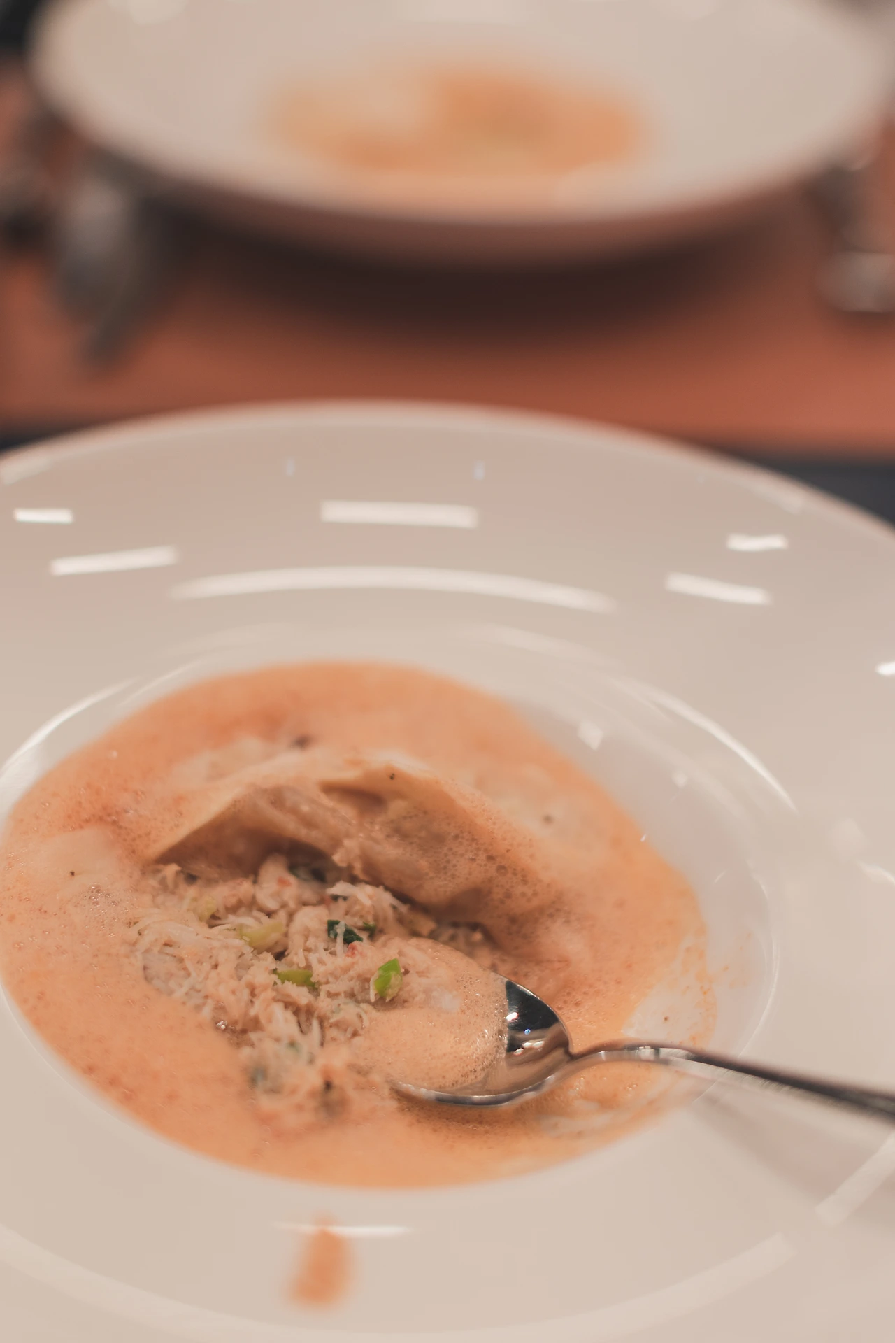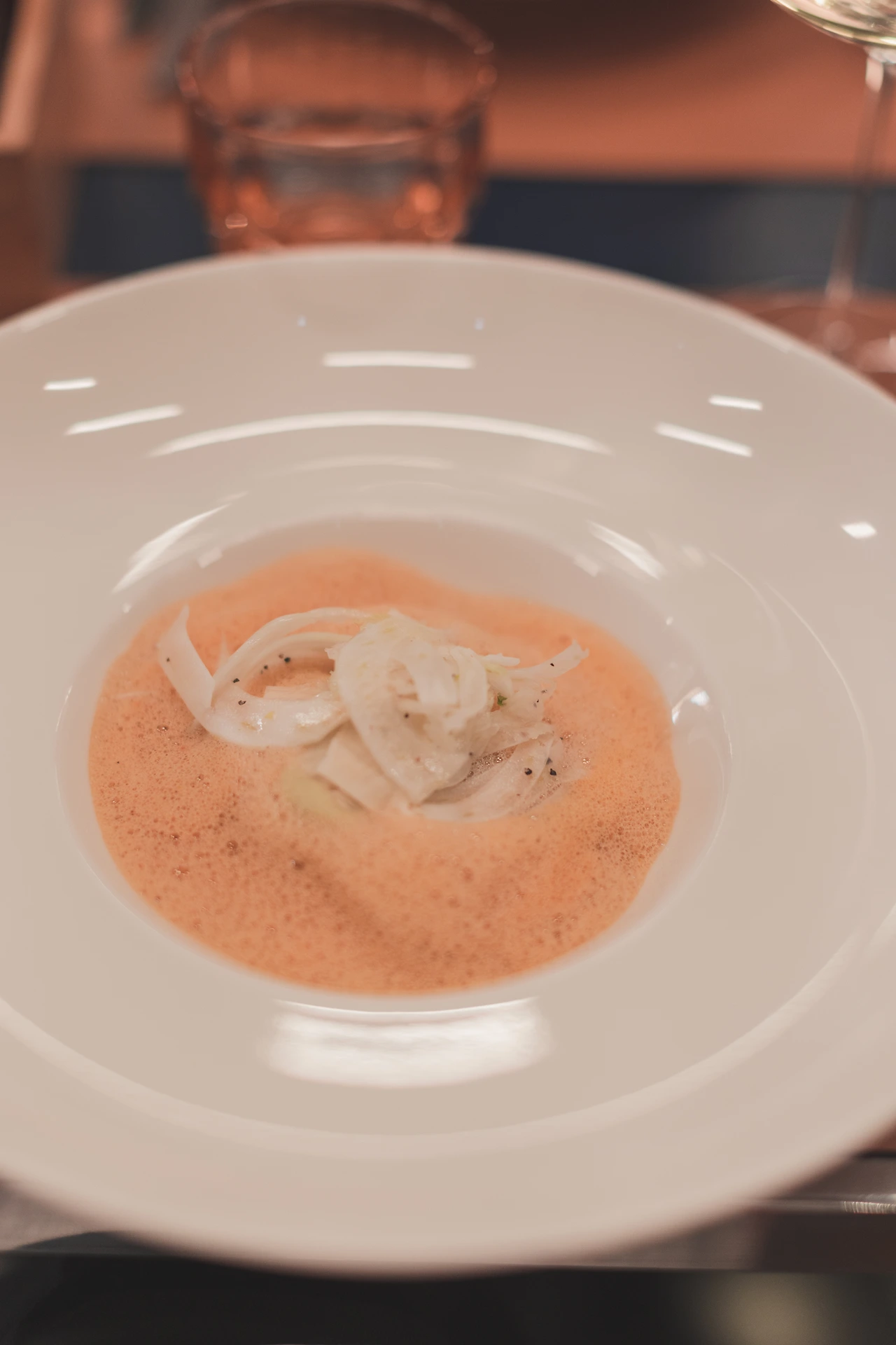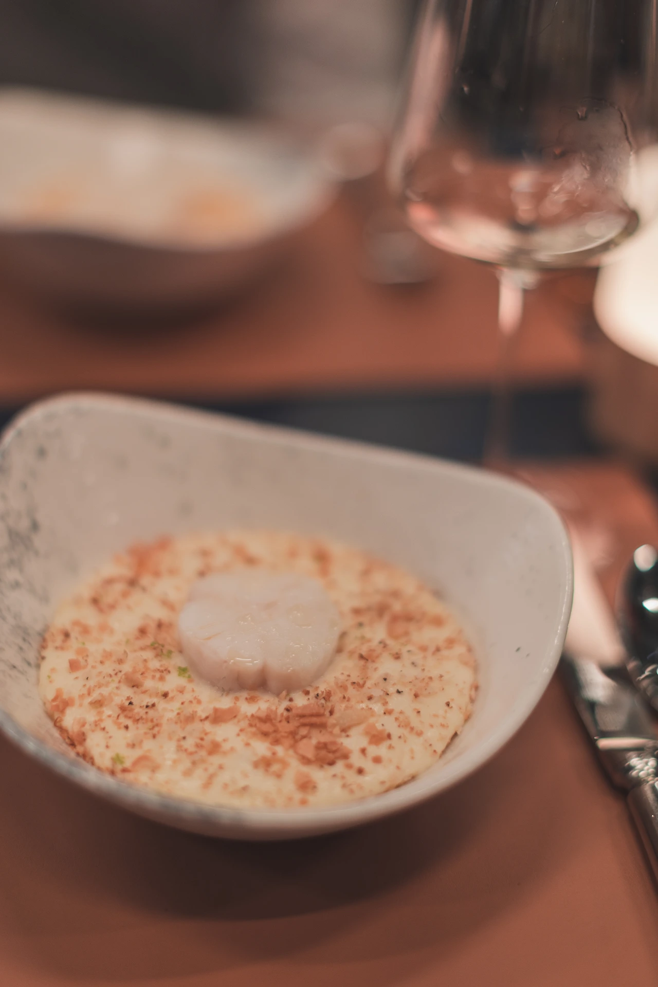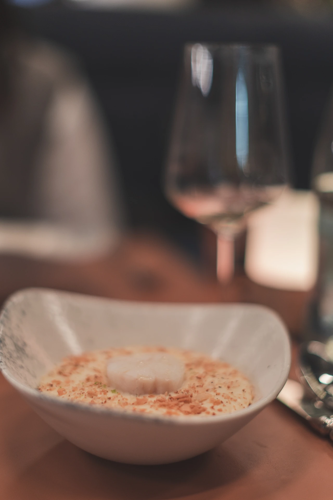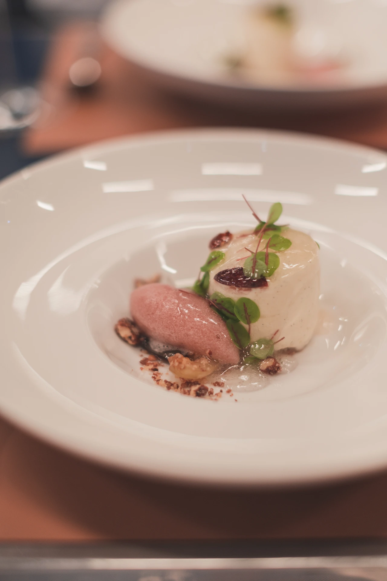 - Dinner Course - Veal and smoked eel tartar, beetersweet turnip and cold crustacean consommé Caramelized scallops and stuffed cabbage with coral Roasted sweetbread and mashed potatoes with brown butter Candied clementine from Corsica and pacake cake, suzette toping