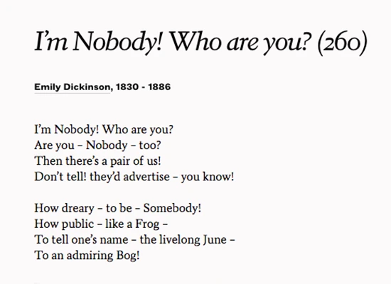 이러한 상황을 드러내는 시가 “I’m Nobody!, Who are you?” 이다. 시에서 ‘I’는 ‘Nobody’, 즉 이름이 없는 사람이다. 게다가 청자에게 당신도 그러한 이름이 없는 사람인지를 물어보고는, ‘우리는 같은 편’이라고 말하는 화자이다. 또한, ‘Nobody’와는 달리 이름을 떨친 ‘Somebody’가 되는 일은 ‘dreary’한 일이 아니냐며 청자에게 당연한 일인 듯 되묻기도 한다. 그러면서 화자는 ‘Somebody’는 개구리처럼 요란 하기만 할 뿐이라고 말한다.
